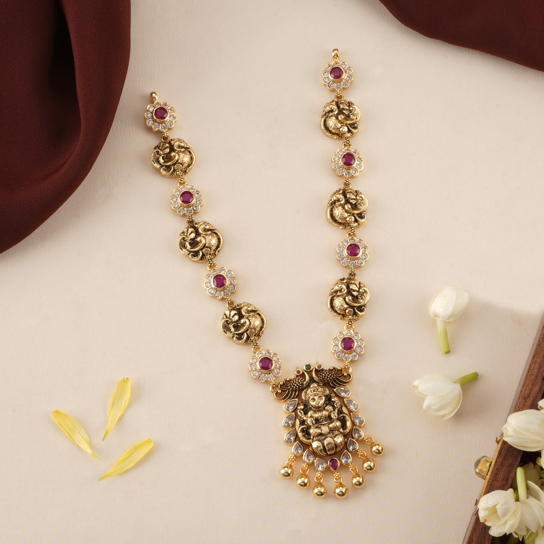 Handcrafted in 92.5 Silver with an antique gold-plated finish, this necklace features Lakshmi and peacock motifs, symbolizing divinity and beauty.