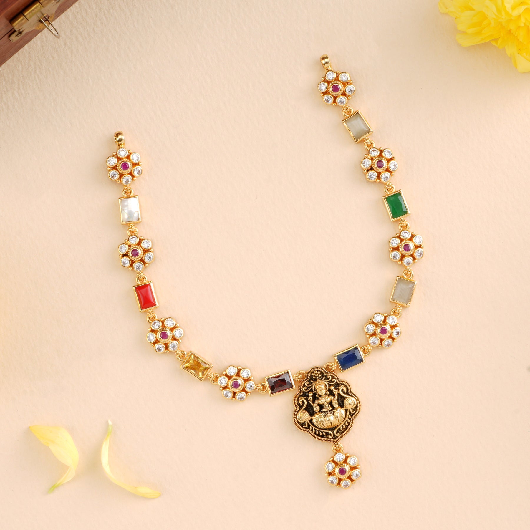 Made in 92.5 Silver with a gold-plated finish, this antique necklace pairs Lakshmi motifs with navaratna stones for a divine, colourful look.