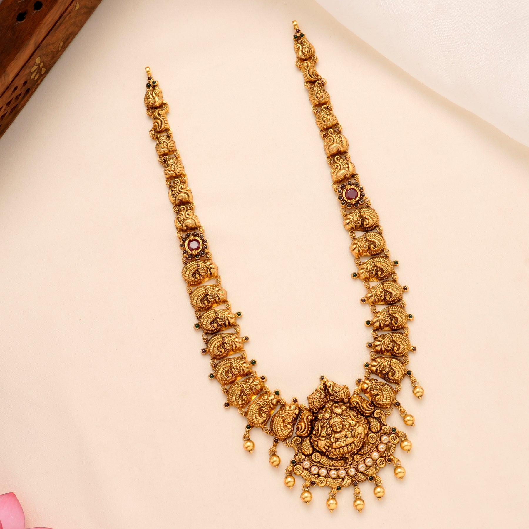 Made from 92.5 silver with a gold-plated finish, this haram depicts divine Lakshmi with peacock motifs and golden drops, symbolizing beauty and devotion.