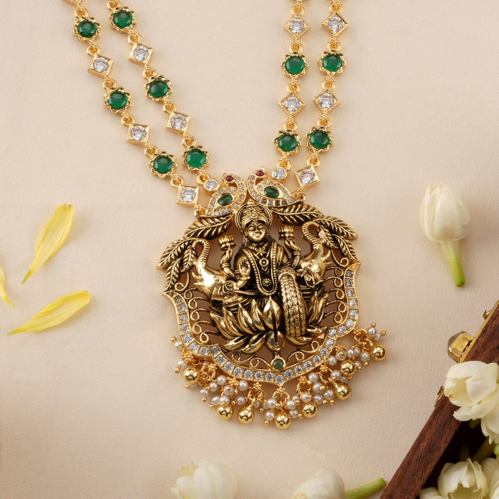 Choose from the grandeur of the Antique Coral & White Stone Lakshmi Haram (₹34,200) or the intricate Heritage Emerald Lakshmi Necklace (₹36,950). Whether it’s the majestic Two-Layer Regal Peacock Haram (₹35,850) or the elegant Pearl Drop with Lakshmi Antique Necklace (₹9,200)—every necklace tells a story.