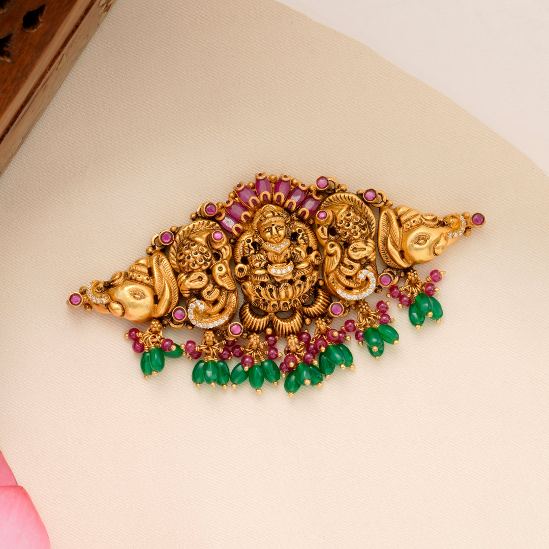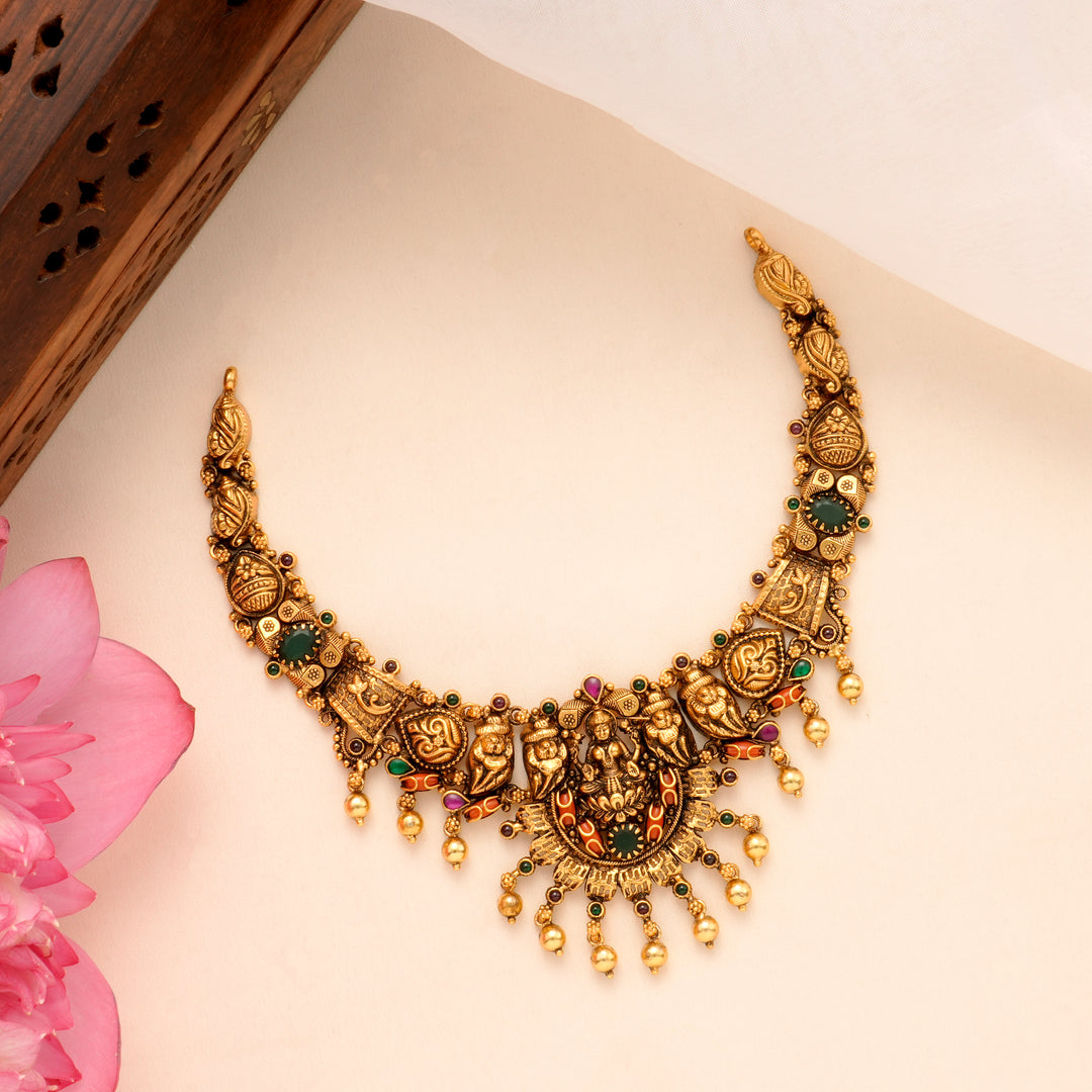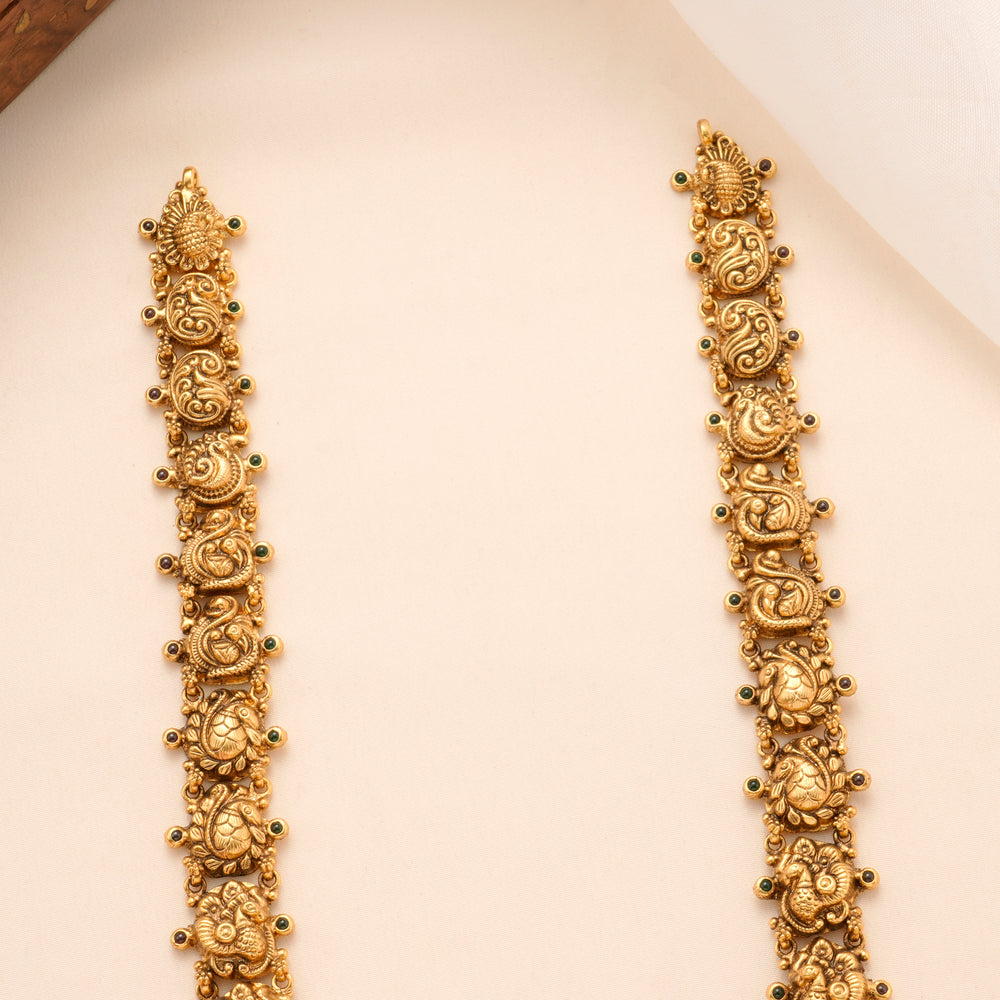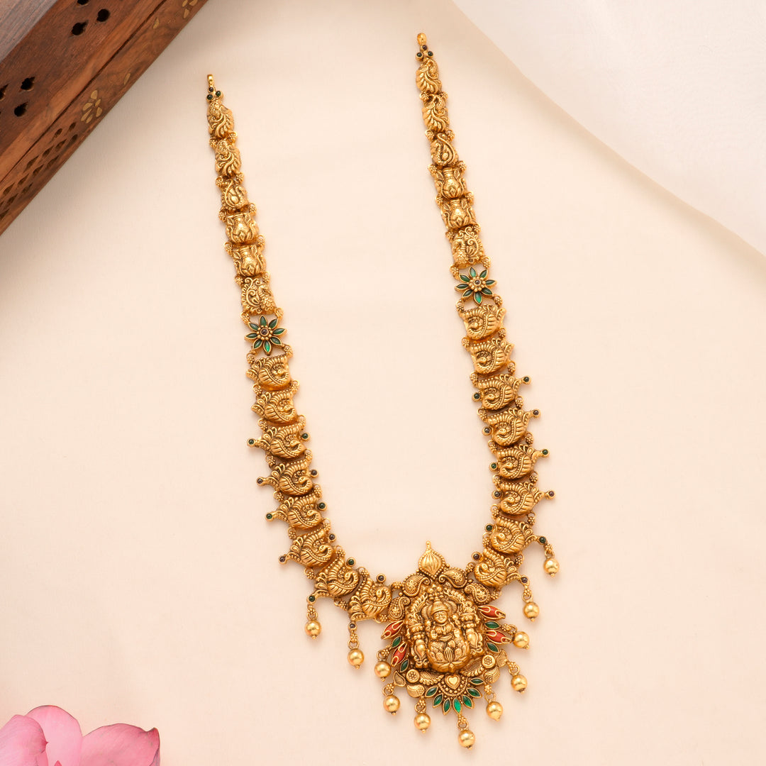 Drawing from Tamil Nadu's ancient temple architecture, our necklaces feature sacred motifs such as Goddess Lakshmi, peacocks, and divine symmetry. Each piece embodies the elegance of temple heritage and the precision of modern craft.