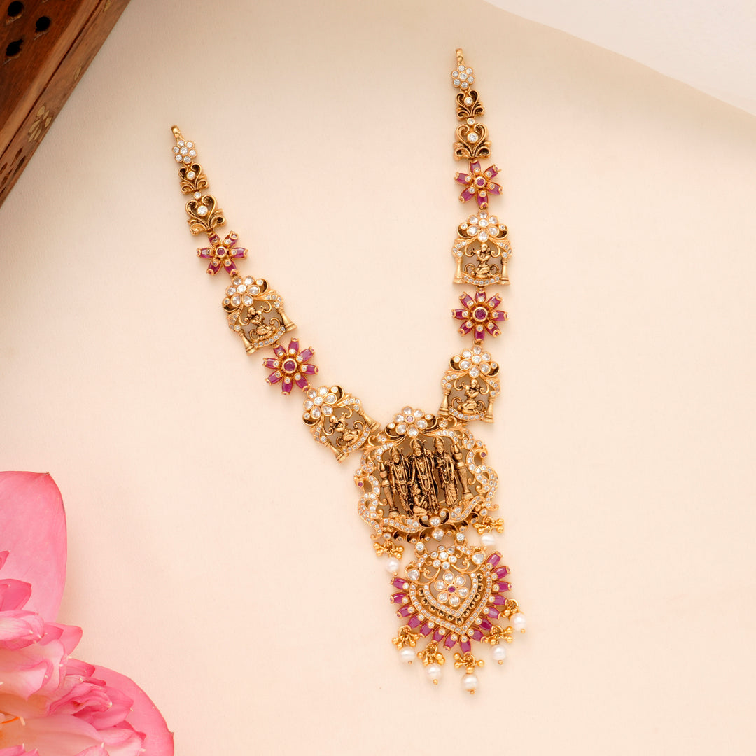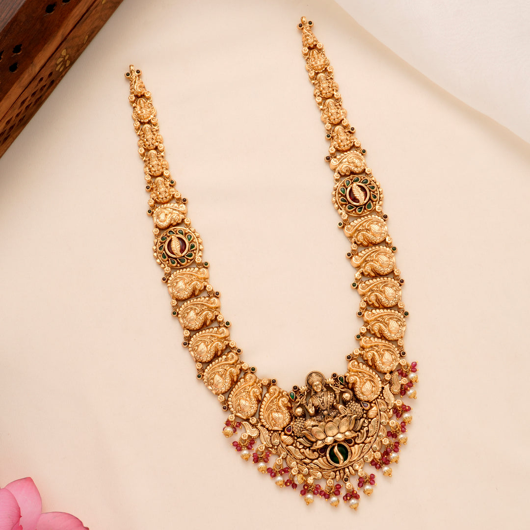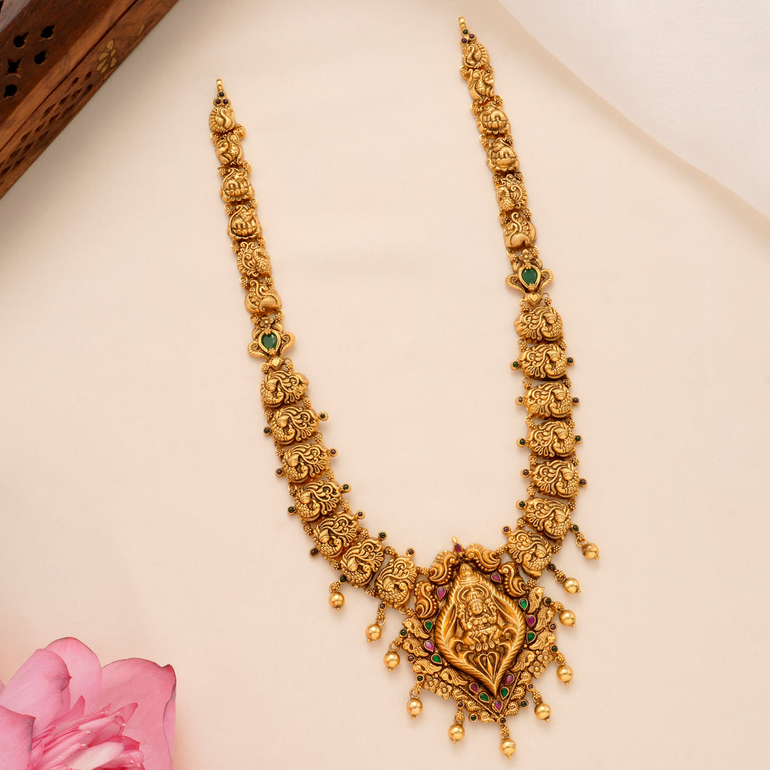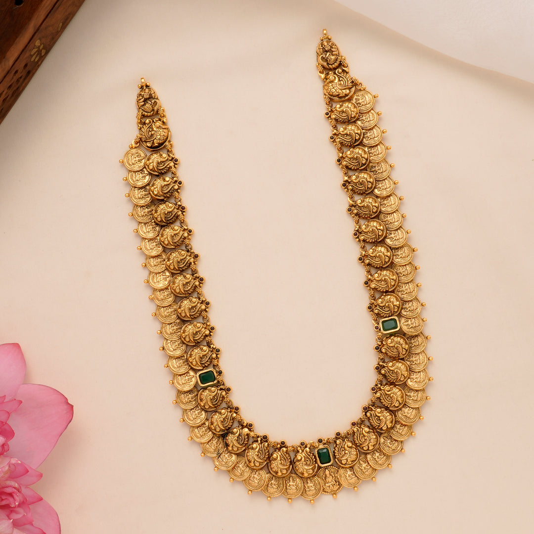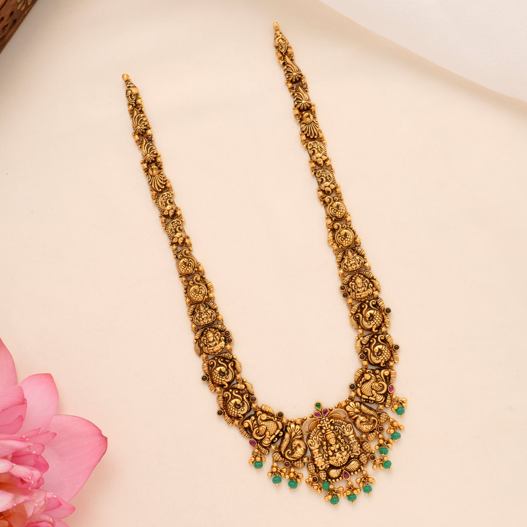 Choose from the grandeur of the Antique Coral & White Stone Lakshmi Haram (₹34,200) or the intricate Heritage Emerald Lakshmi Necklace (₹36,950). Whether it’s the majestic Two-Layer Regal Peacock Haram (₹35,850) or the elegant Pearl Drop with Lakshmi Antique Necklace (₹9,200)—every necklace tells a story.