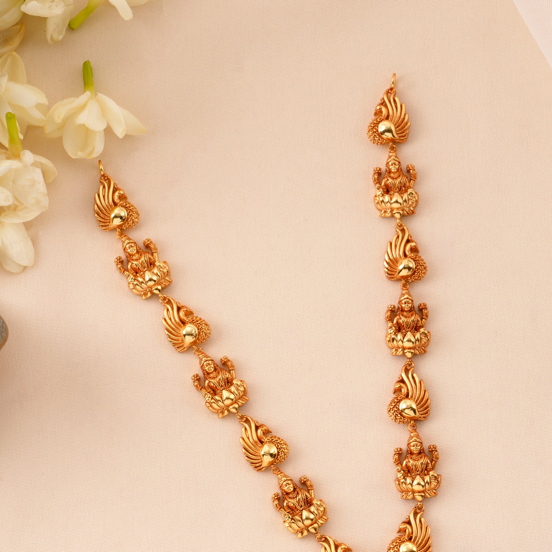 Crafted in 92.5 silver with gold plating, this Goddess Lakshmi-Peacock Nagas necklace adds charm, elegance, and festive energy. Its traditional motif enhances the spiritual and aesthetic appeal of your attire.