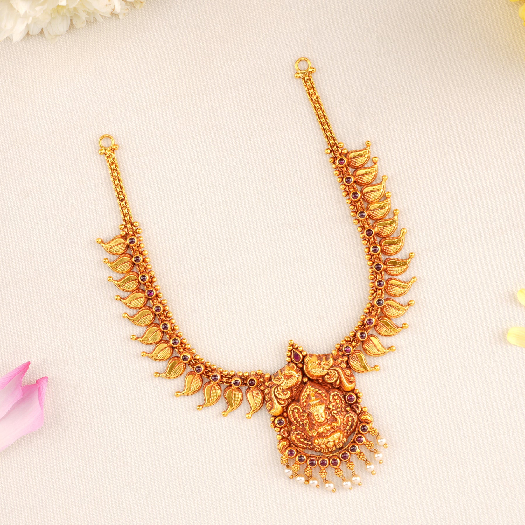Designed in 92.5 silver and coated with traditional gold plating, this necklace carries Kerala-style Lakshmi motifs, exuding cultural elegance.