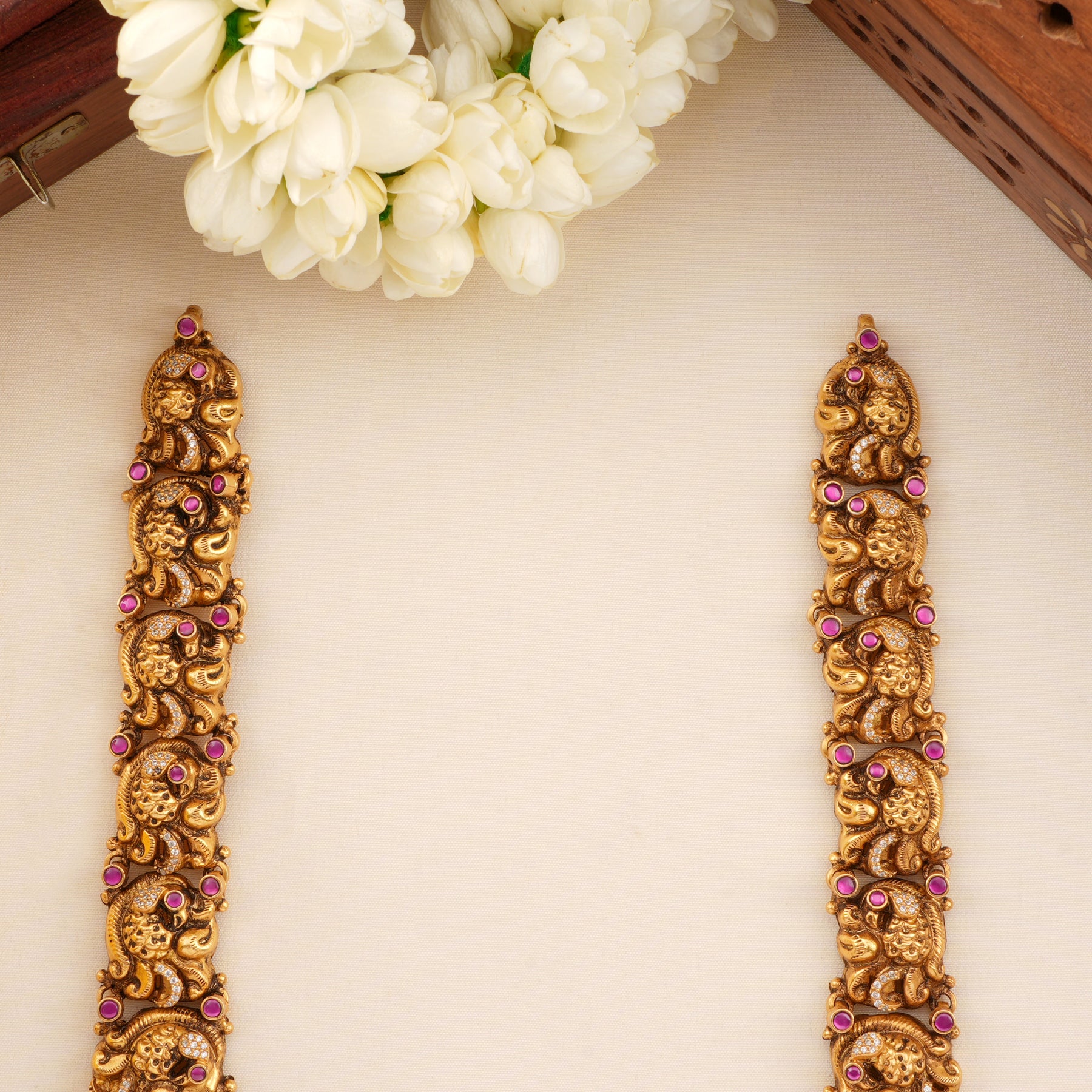This elegant haram, crafted in 92.5 silver with gold plating, features Lakshmi motifs with emerald drops for a graceful and divine finish.