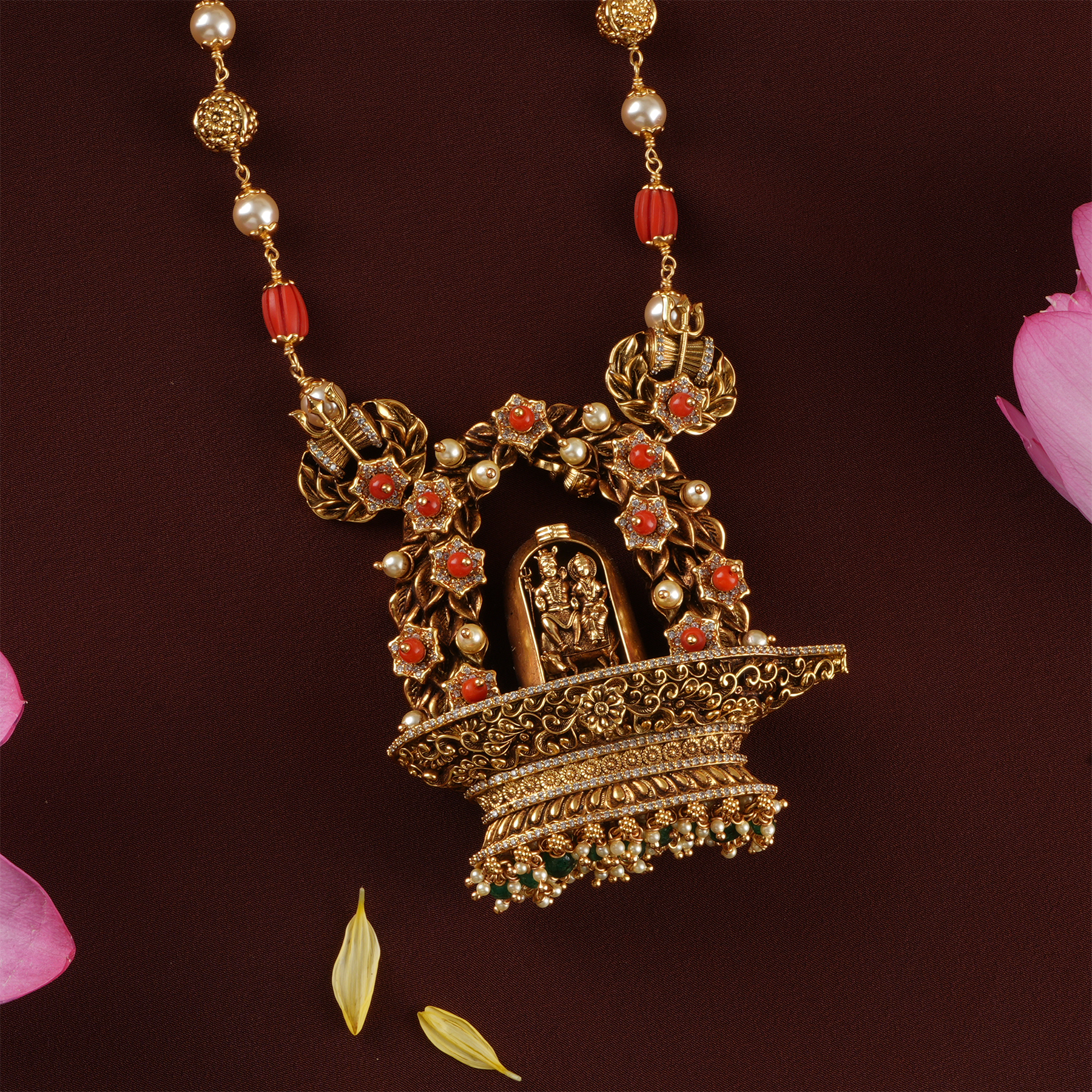 This haram, crafted in 92.5 Silver with a gold-plated finish, showcases a detailed Shiva-Parvati pendant with traditional beads for a classic temple jewellery style.