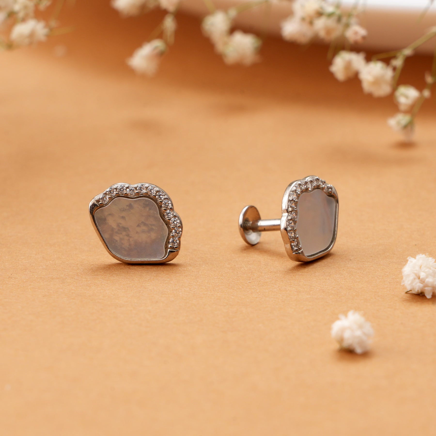 Crafted in 92.5 Sterling Silver, these studs feature mother of pearl accented with white stones, adding a refined sparkle to your look.