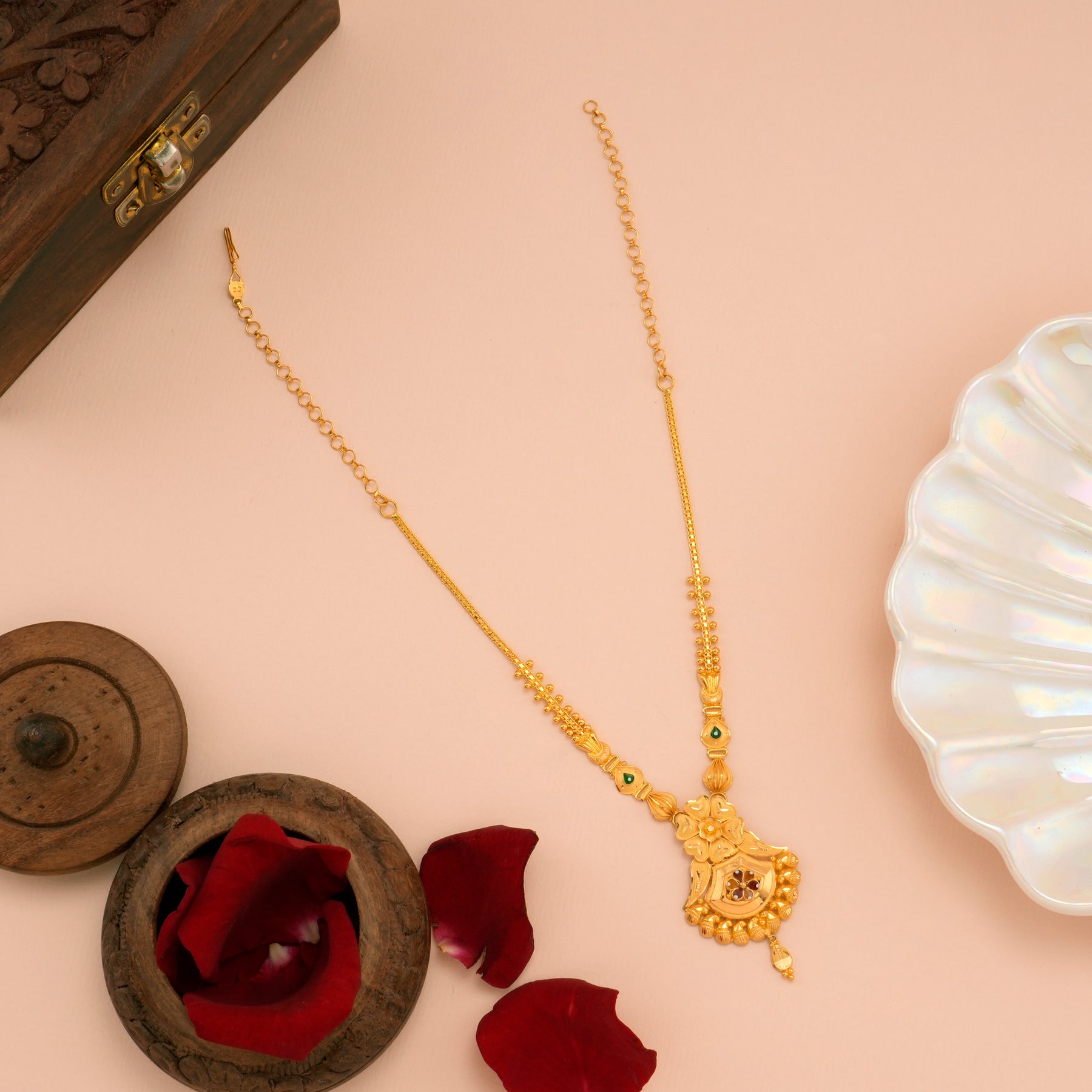 This 22k gold necklace features a beautifully crafted floral pattern that exudes charm and refinement. The fine detailing highlights traditional elegance with a touch of modern sophistication.