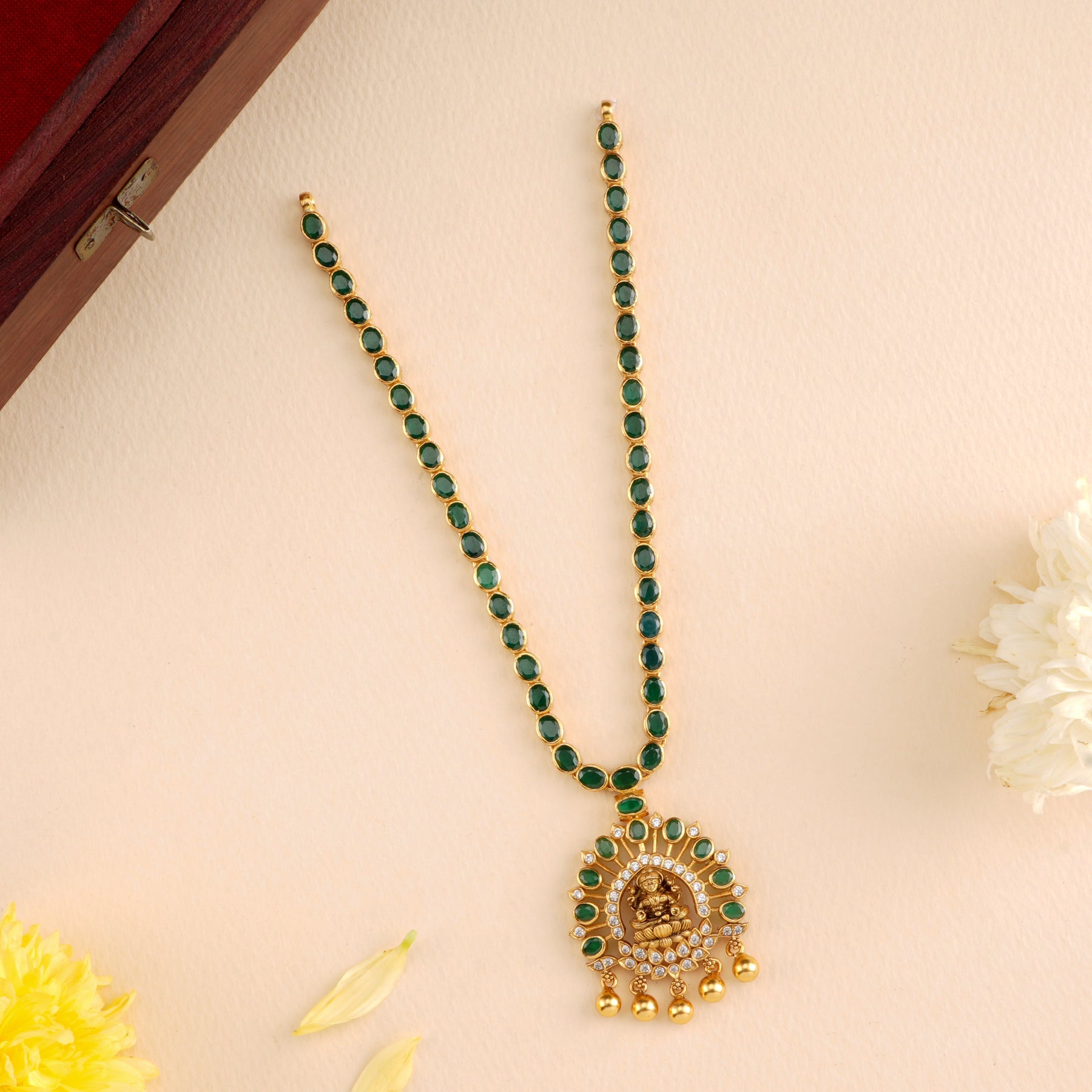 Made in 92.5 sterling silver with a gold-plated finish, this necklace highlights divine Lakshmi motifs combined with grass-like emerald designs for a temple-inspired elegance.
