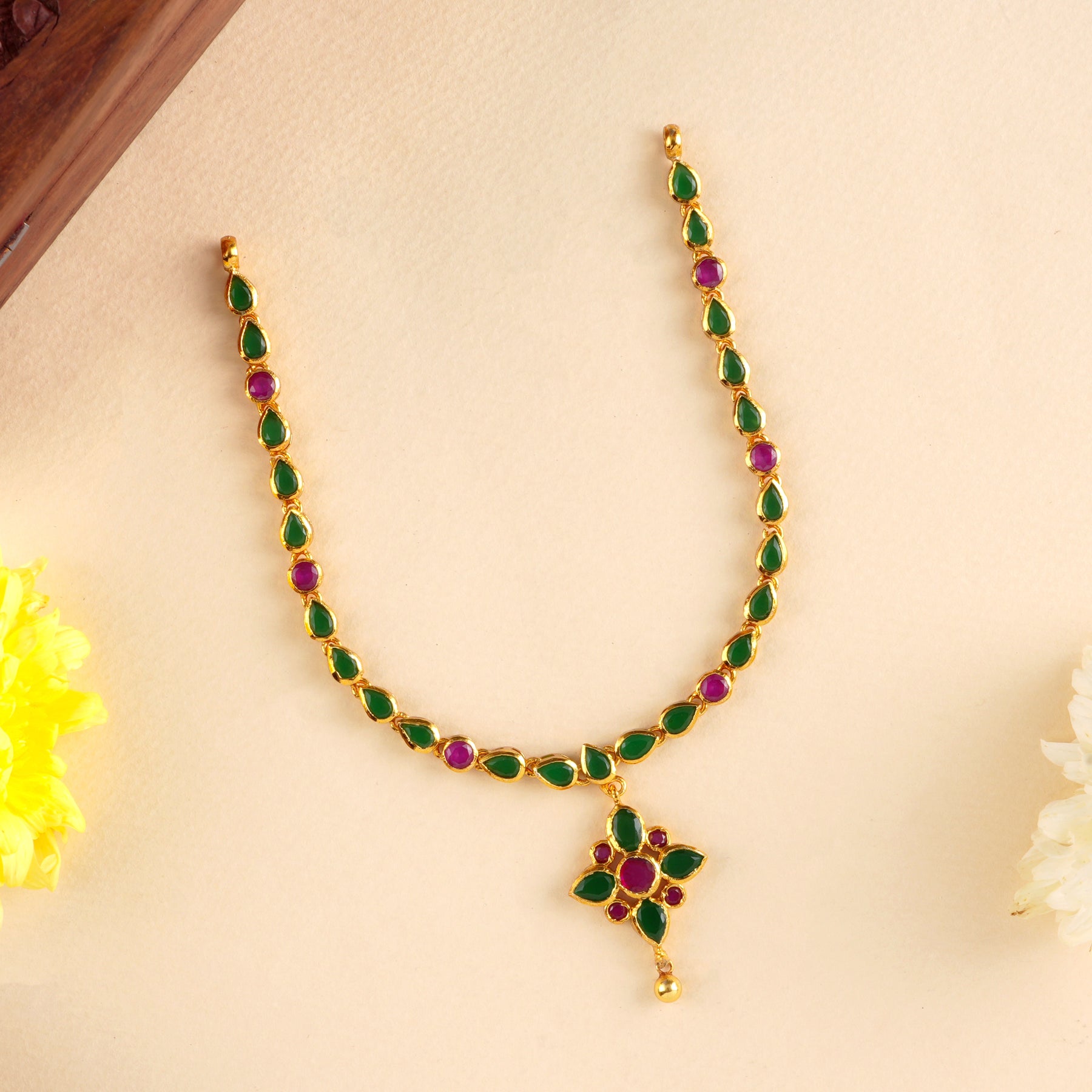 Handcrafted in 92.5 sterling silver with a gold-plated finish, this elegant single-layer necklace features alternating ruby and emerald stones with a delicate drop accent.