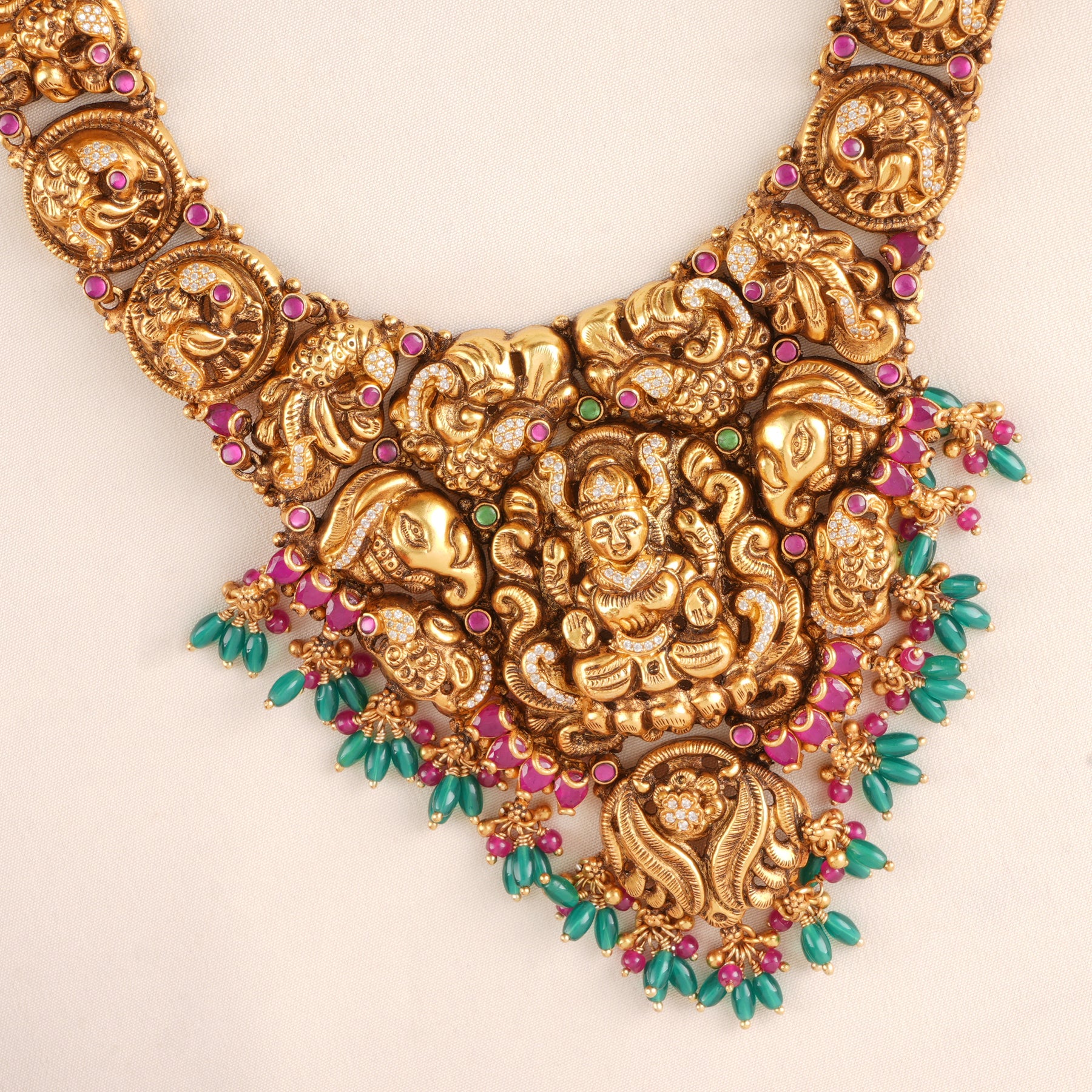 Crafted in 92.5 Sterling Silver with a gold-plated finish, this haram features intricate Lakshmi motifs adorned with green and pink beads, radiating traditional elegance.