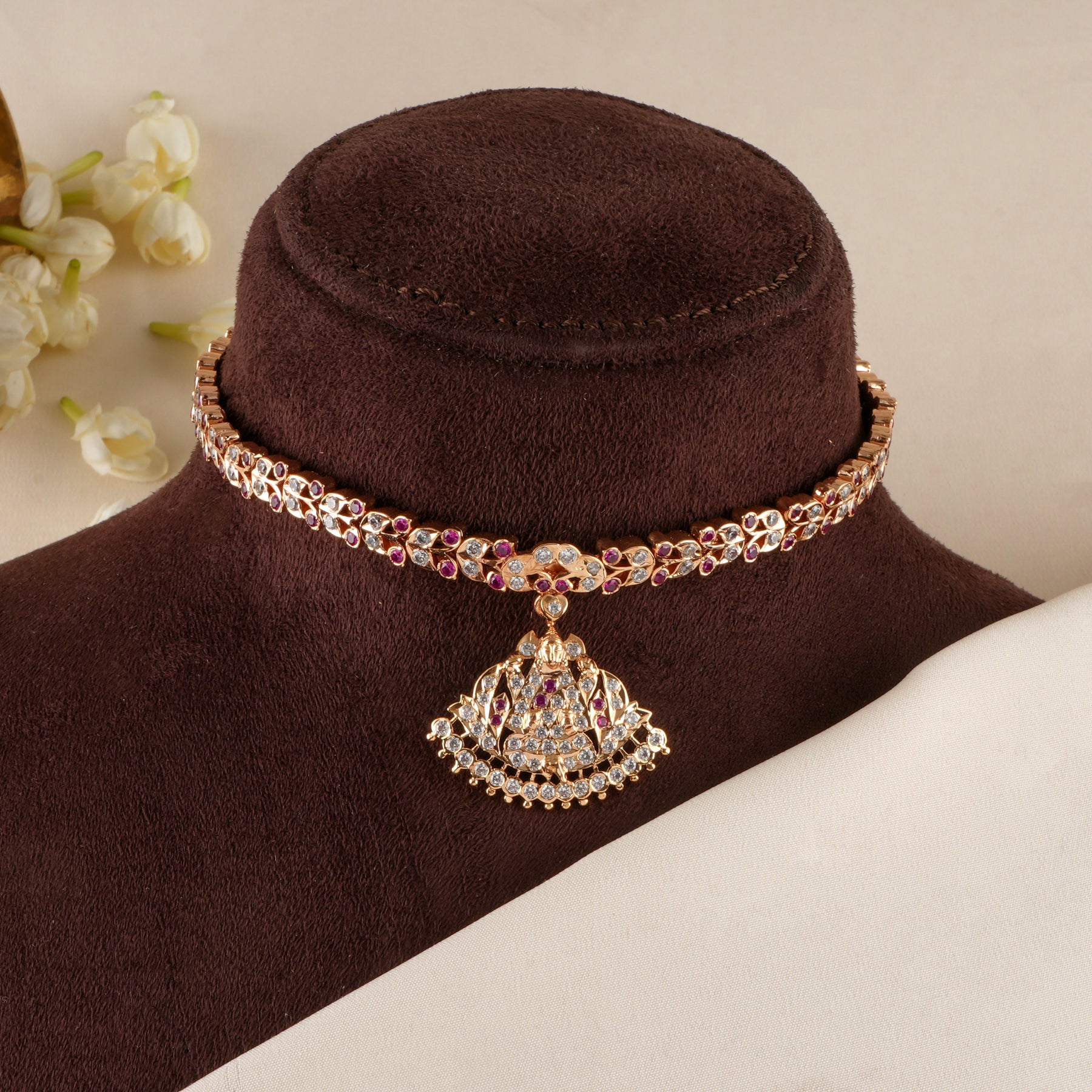 Crafted in 92.5 Silver with a gold-plated finish, this traditional attikai necklace features a graceful leaf-shaped ruby pendant, bringing nature-inspired elegance to festive and bridal looks.