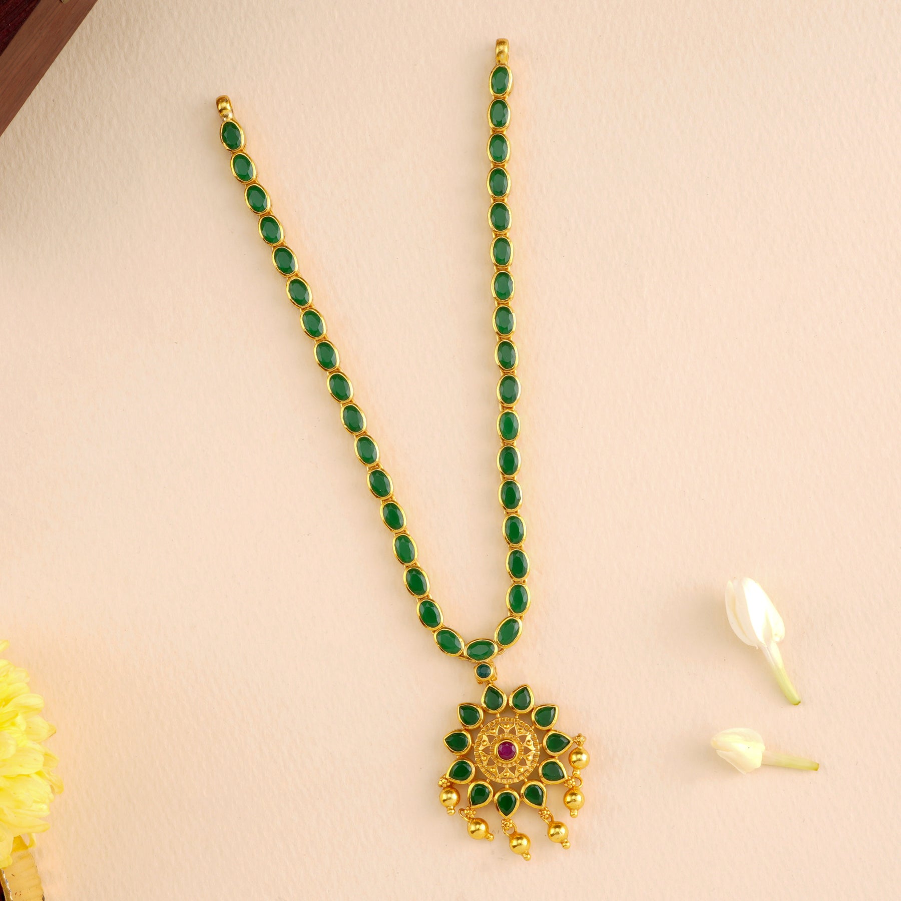 Crafted with 92.5 sterling silver and a gold-plated finish, this modern-style necklace features emerald drops arranged in a chic design for versatile wear.