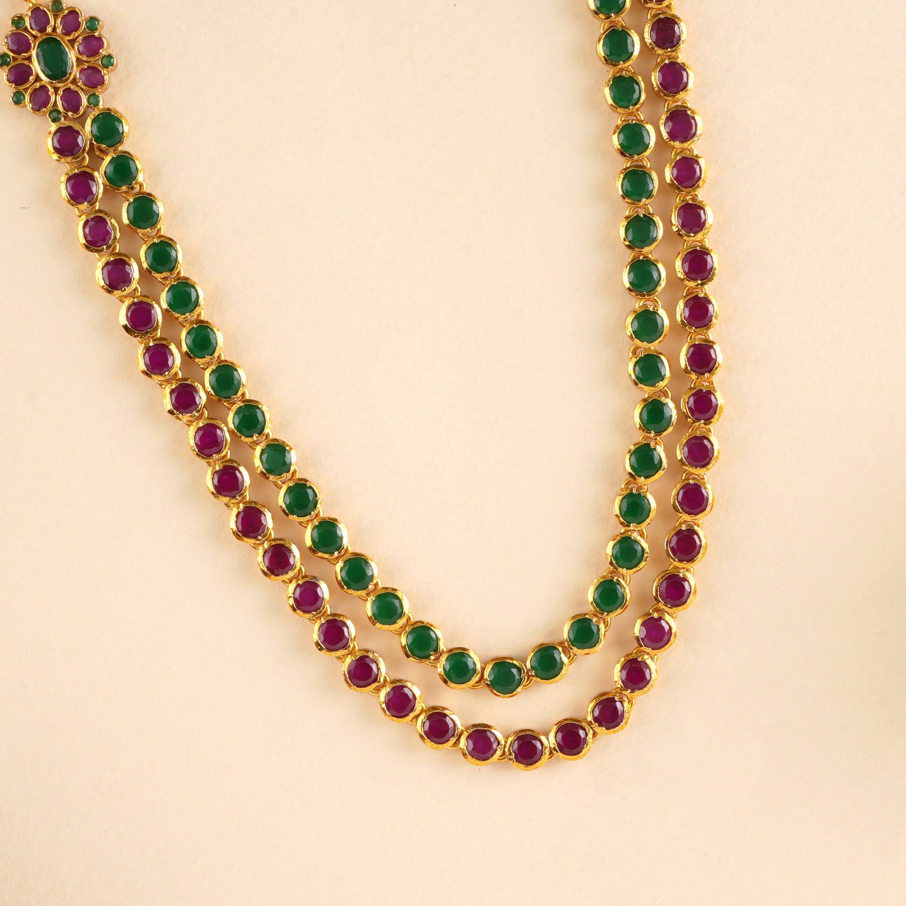 Made in 92.5 sterling silver with a gold-plated finish, this two-step necklace balances ruby and emerald stones in a striking layered design.