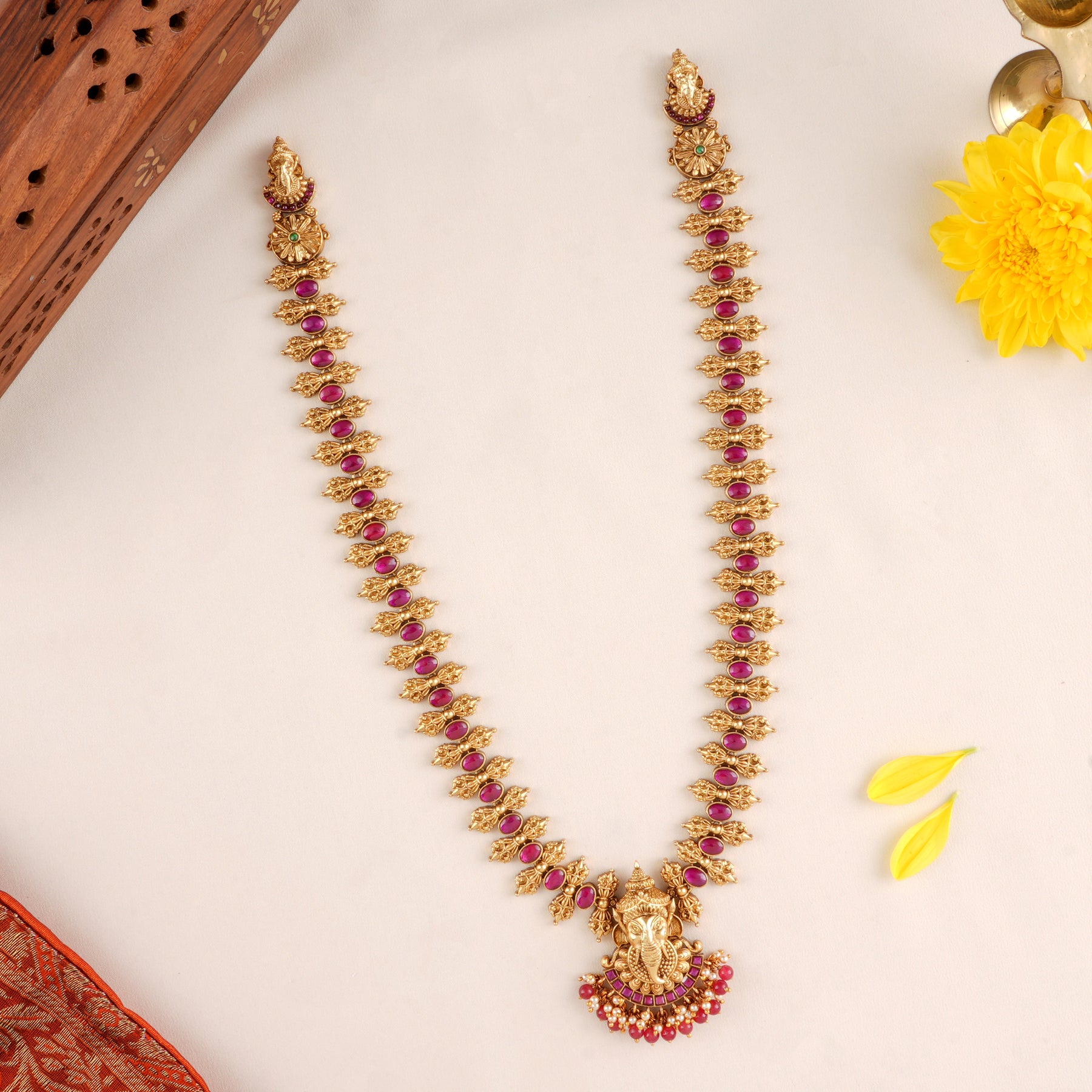 Crafted in 92.5 Sterling Silver with a gold-plated finish, this haram features a Ganesha pendant adorned with ruby stones and beads, adding a colourful and spiritual charm.
