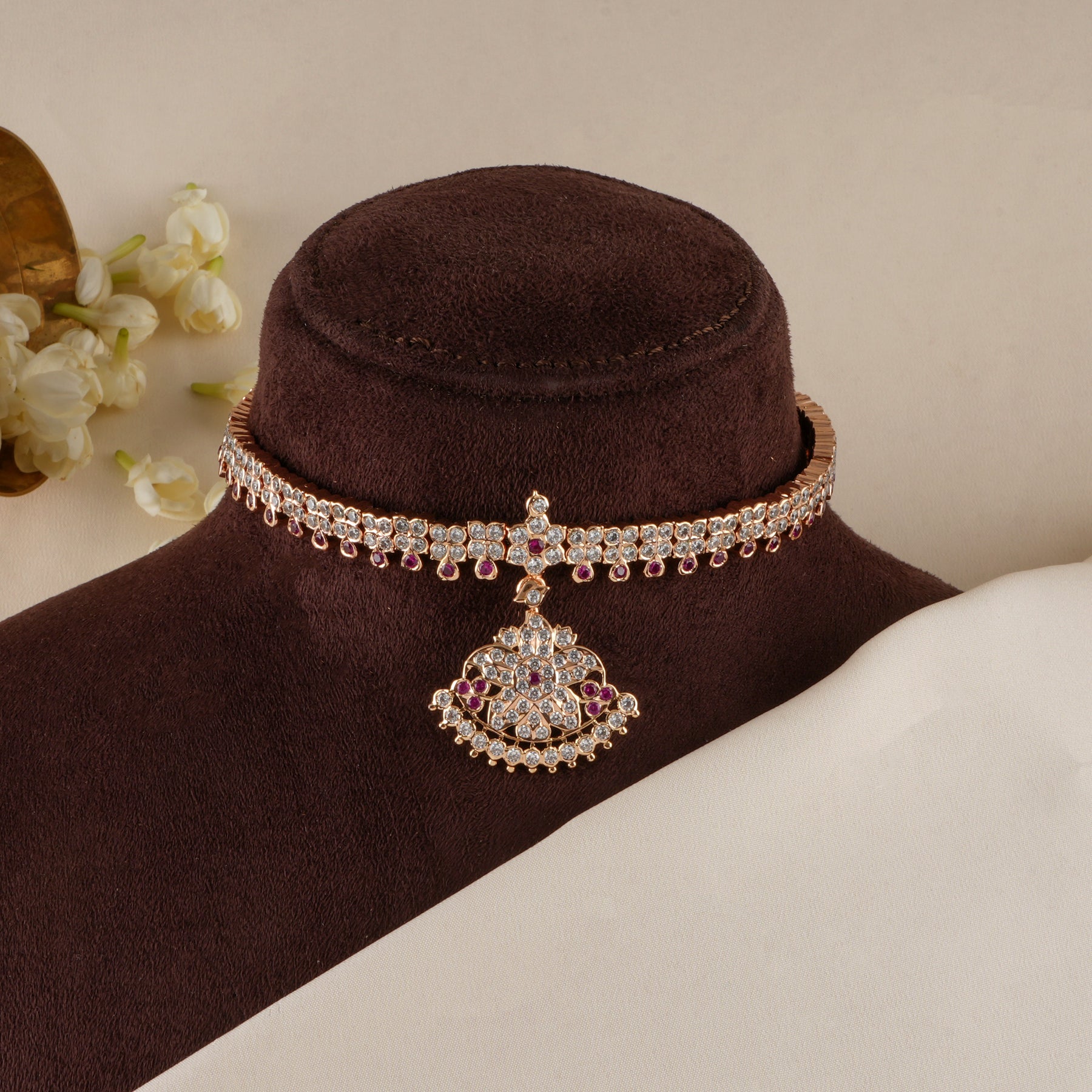 Elegant and divine, this attikai necklace is crafted in 92.5 Silver with a gold-plated finish, adorned with radiant white stones and a striking ruby pendant, perfect for grand occasions.