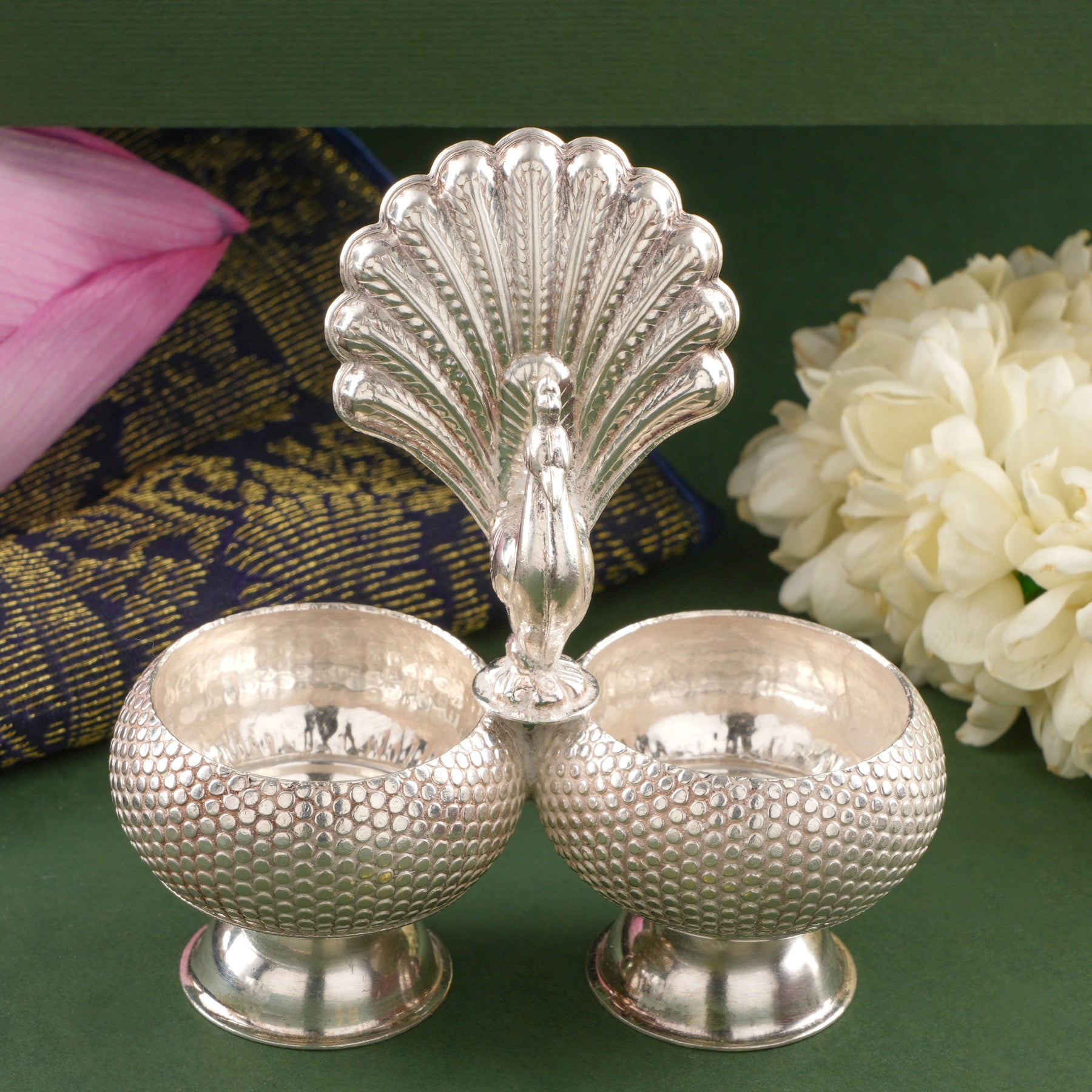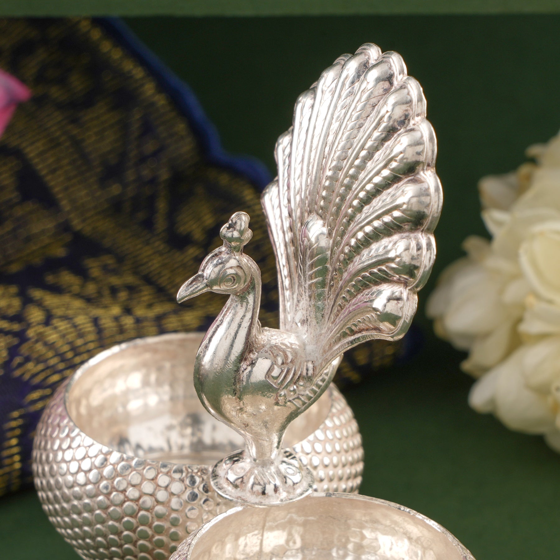This 92.5 Sterling Silver Haldi Kumkum Box with Peacock Pattern blends elegance and traditional pooja utility.