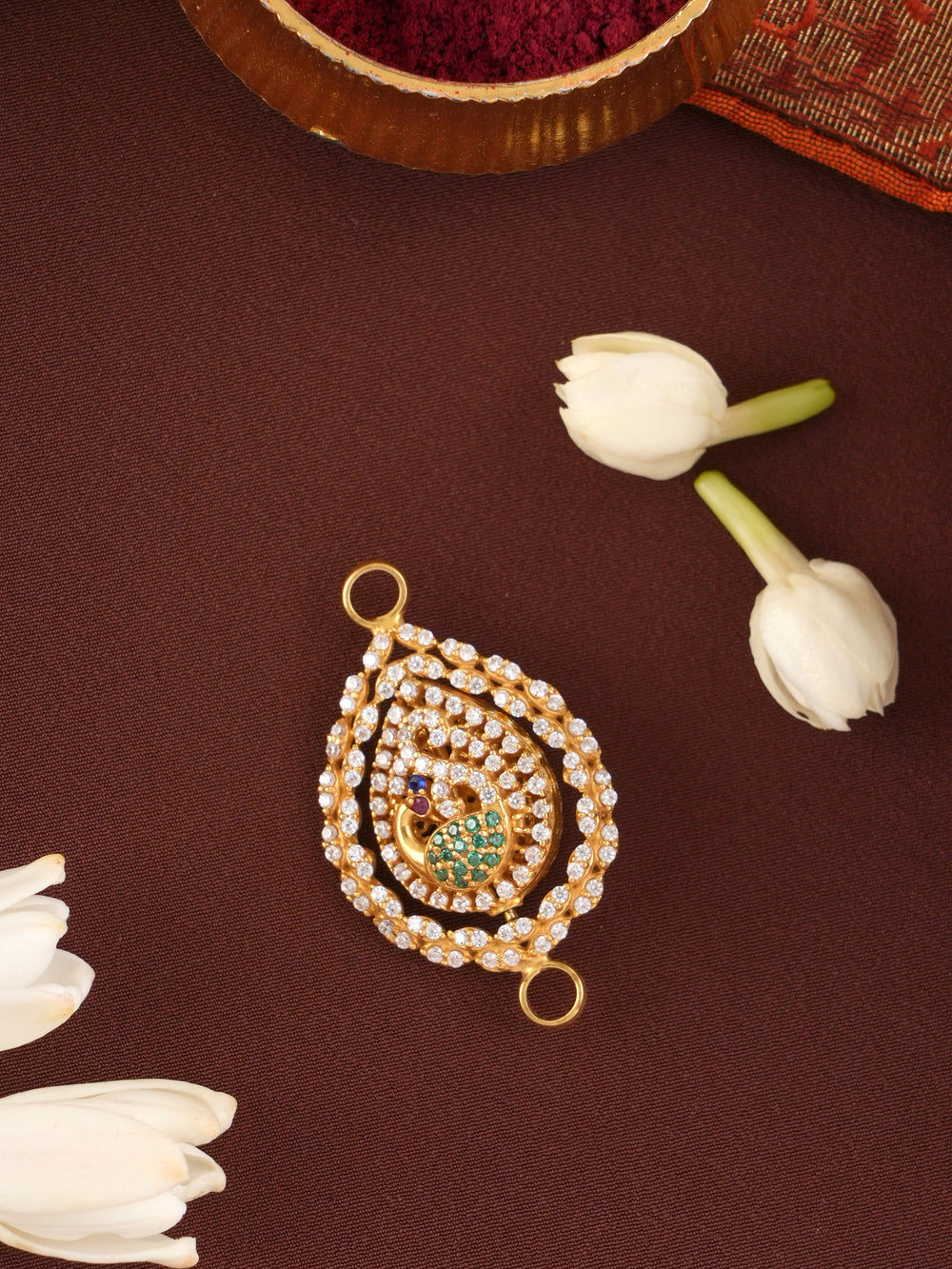 Adorned with twin peacock motifs on either side, this 22k gold Mugappu is a tribute to classical art and heritage. A perfect centrepiece for your Thali chain.