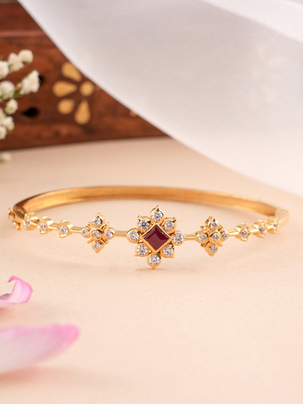 This elegant 22k gold Kada is adorned with floral designs and sparkling ruby stones, adding a royal touch. Its oval shape offers a comfortable fit.