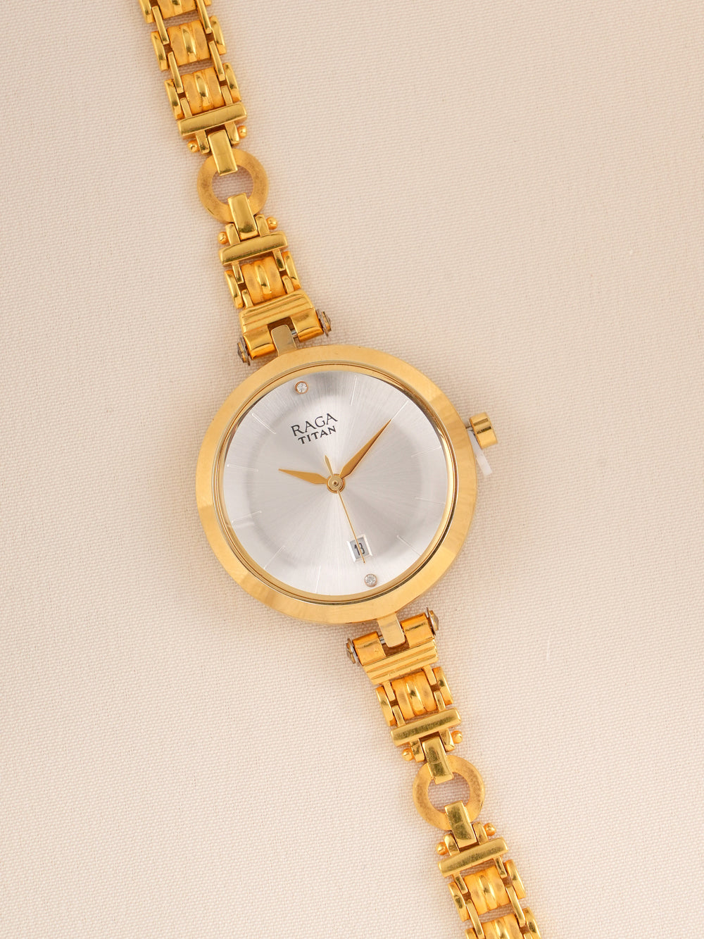 A graceful blend of tradition and trend, this Titan Raga gold watch features a sleek dial and ornamental links that elevate your elegance.