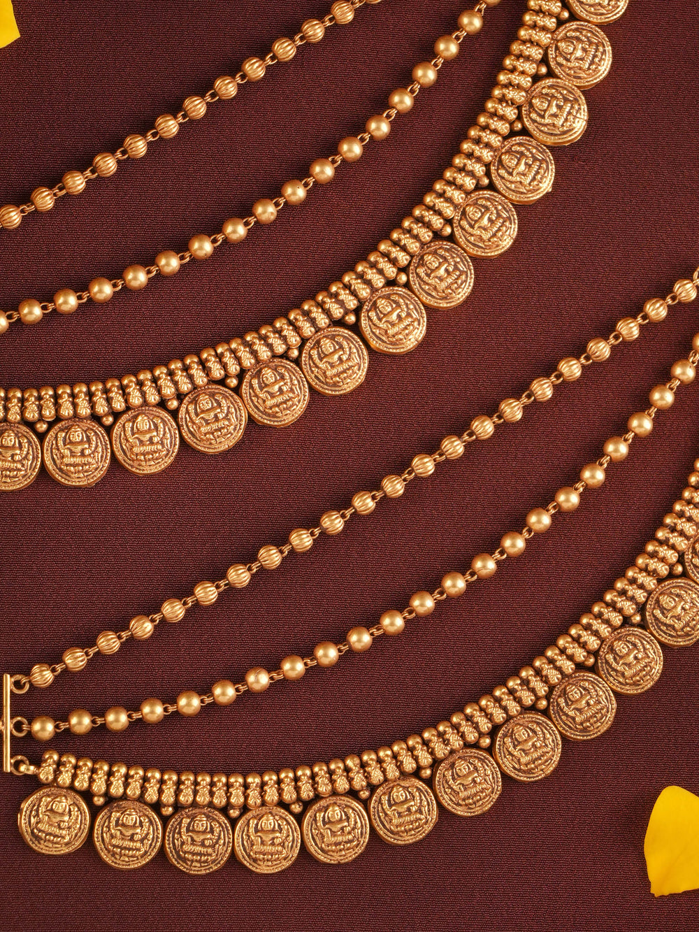 A divine blend of tradition and grace, this triple layered mattal showcases shimmering gold balls and Lakshmi coins that echo spiritual elegance.
