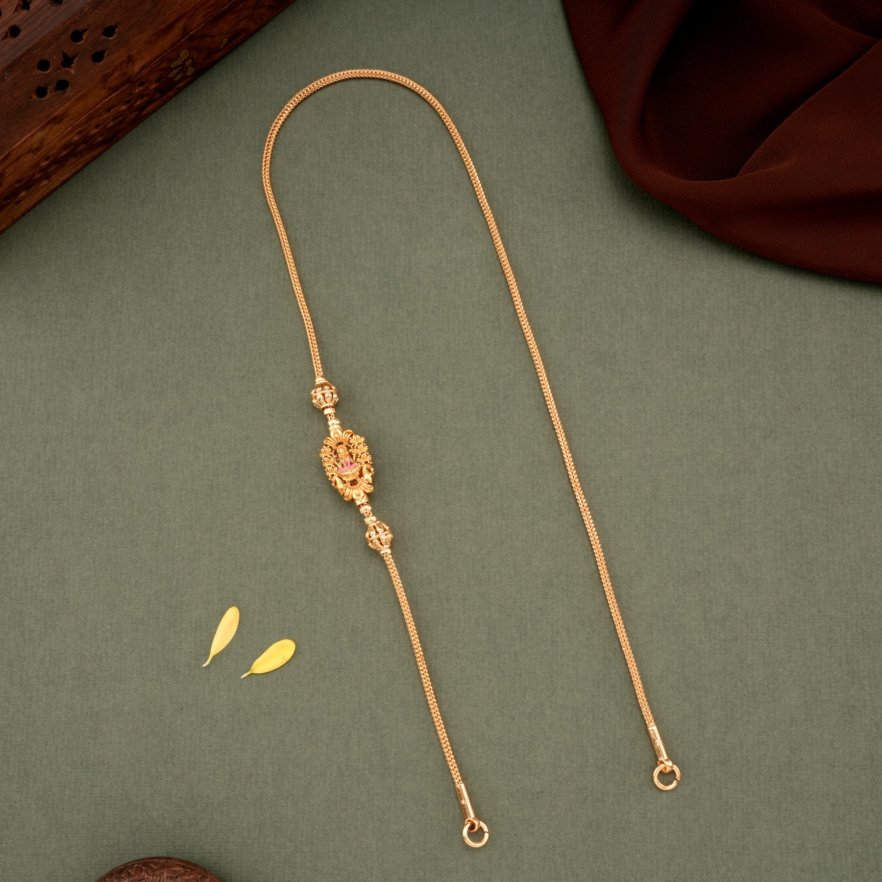 Crafted from 92.5 silver with gold plating, this mugappu chain showcases Goddess Lakshmi with blossom-inspired detailing for graceful traditional wear.