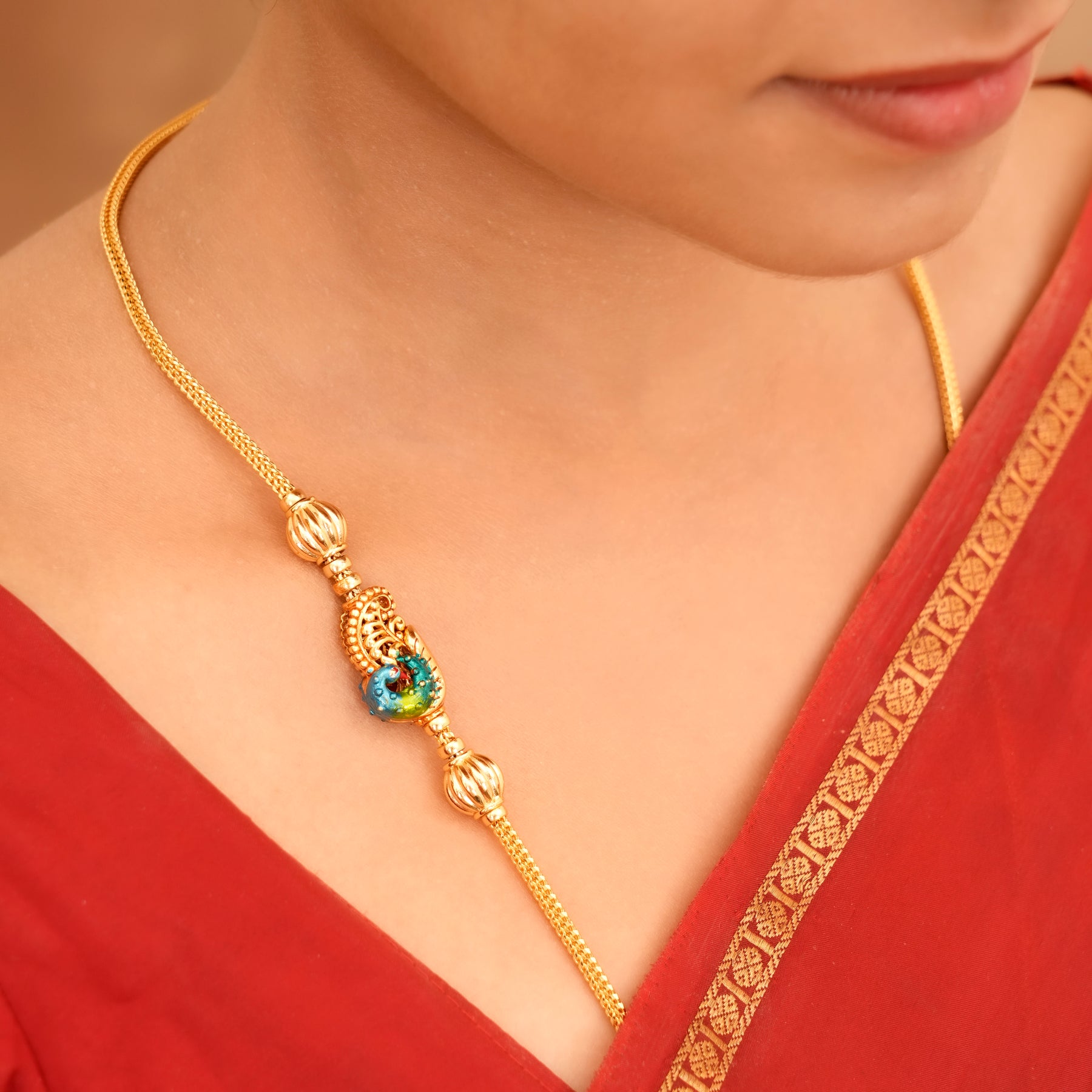 Colourful Peacock Design Golden Mugappu Chain