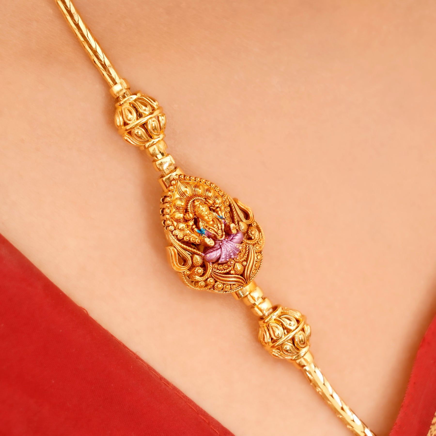 Made from 92.5 sterling silver with gold plating, this Mugappu chain showcases an elegant temple-style Lakshmi design with detailed craftsmanship and cultural charm.