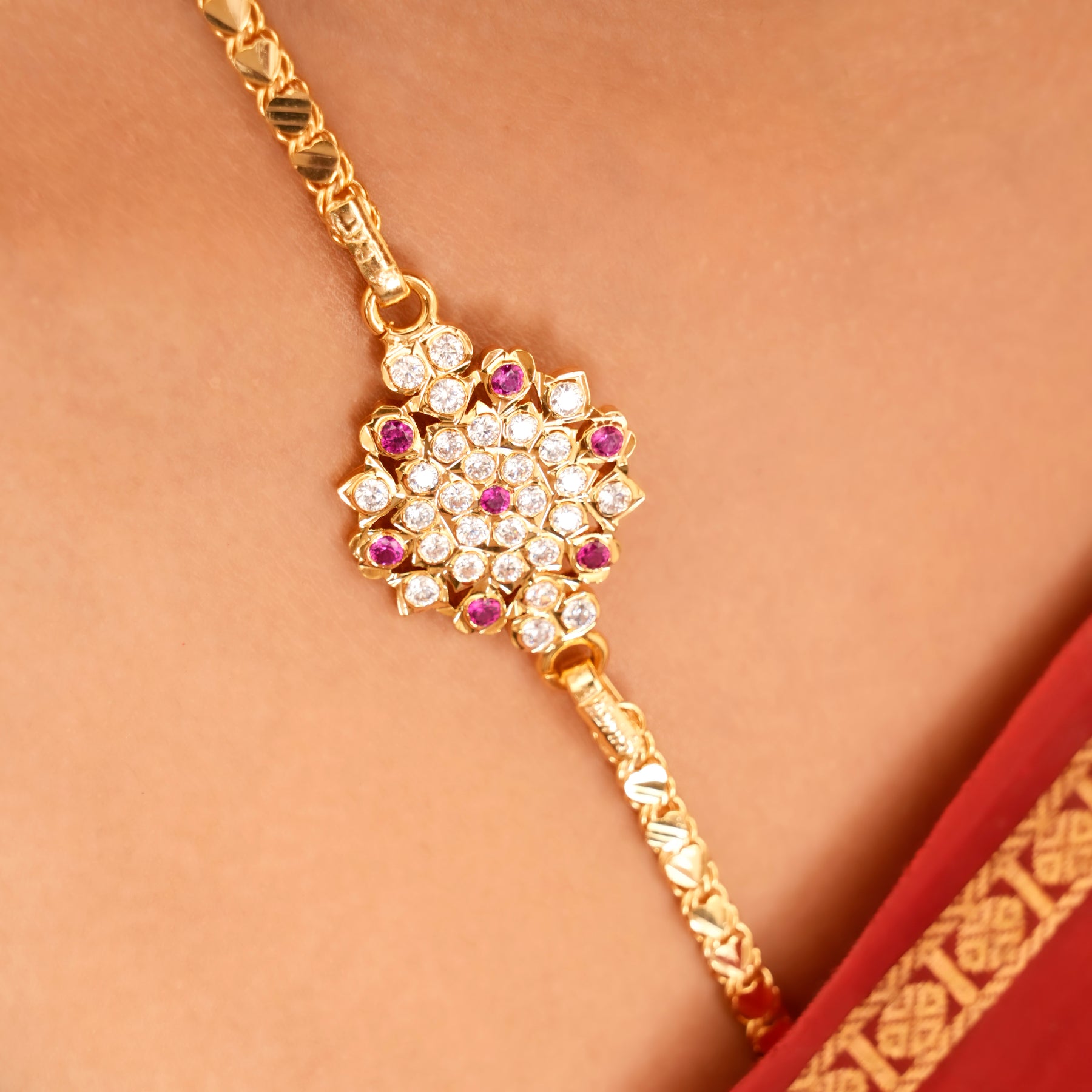 Made from 92.5 sterling silver with gold plating, this Mugappu chain showcases a floral white stone design with graceful traditional detailing.
