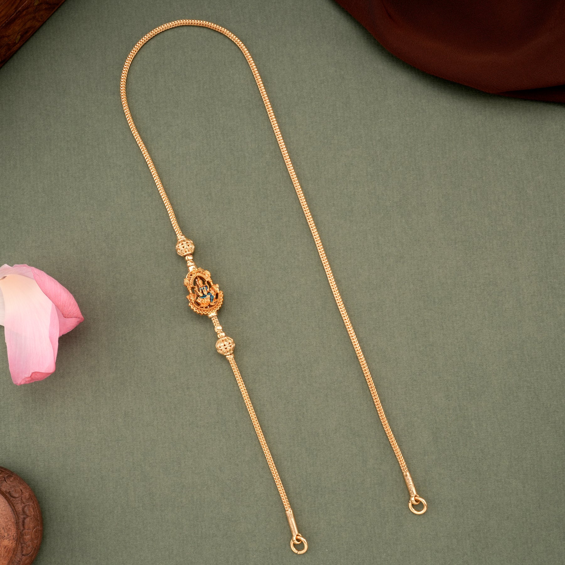 This 92.5 silver gold-plated mugappu chain features Goddess Lakshmi framed in a floral shape, reflecting graceful traditional elegance.
