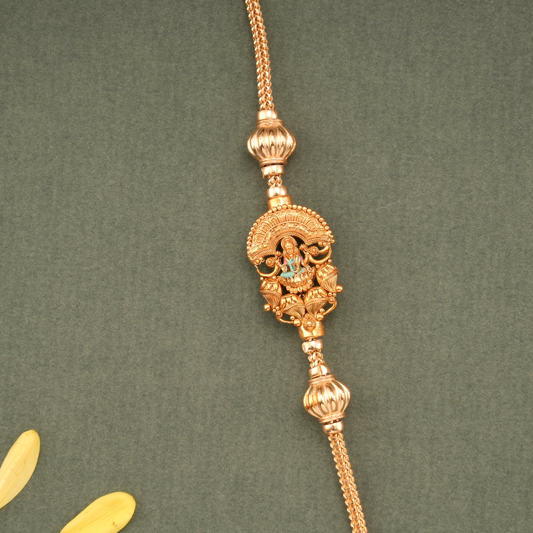 Designed in 92.5 silver with gold plating, this vintage Lakshmi mugappu chain reflects antique temple aesthetics for a heritage look.