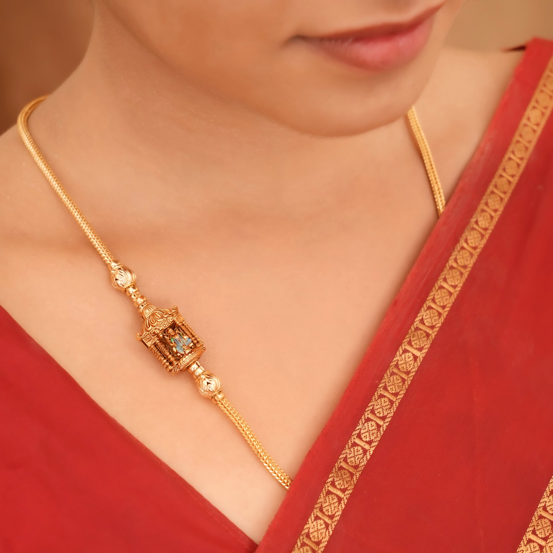 Made from 92.5 silver with gold finish, this Mugappu chain showcases a heritage Lakshmi design, reflecting timeless artistry inspired by traditional craftsmanship.