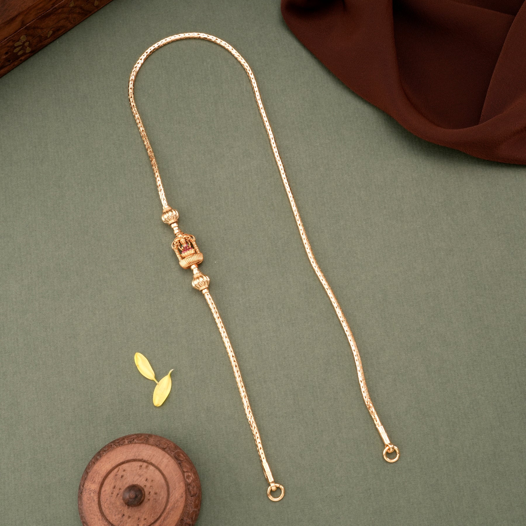 Made of 92.5 silver with gold plating, this Lakshmi mugappu chain features traditional detailing suitable for festive and devotional wear.