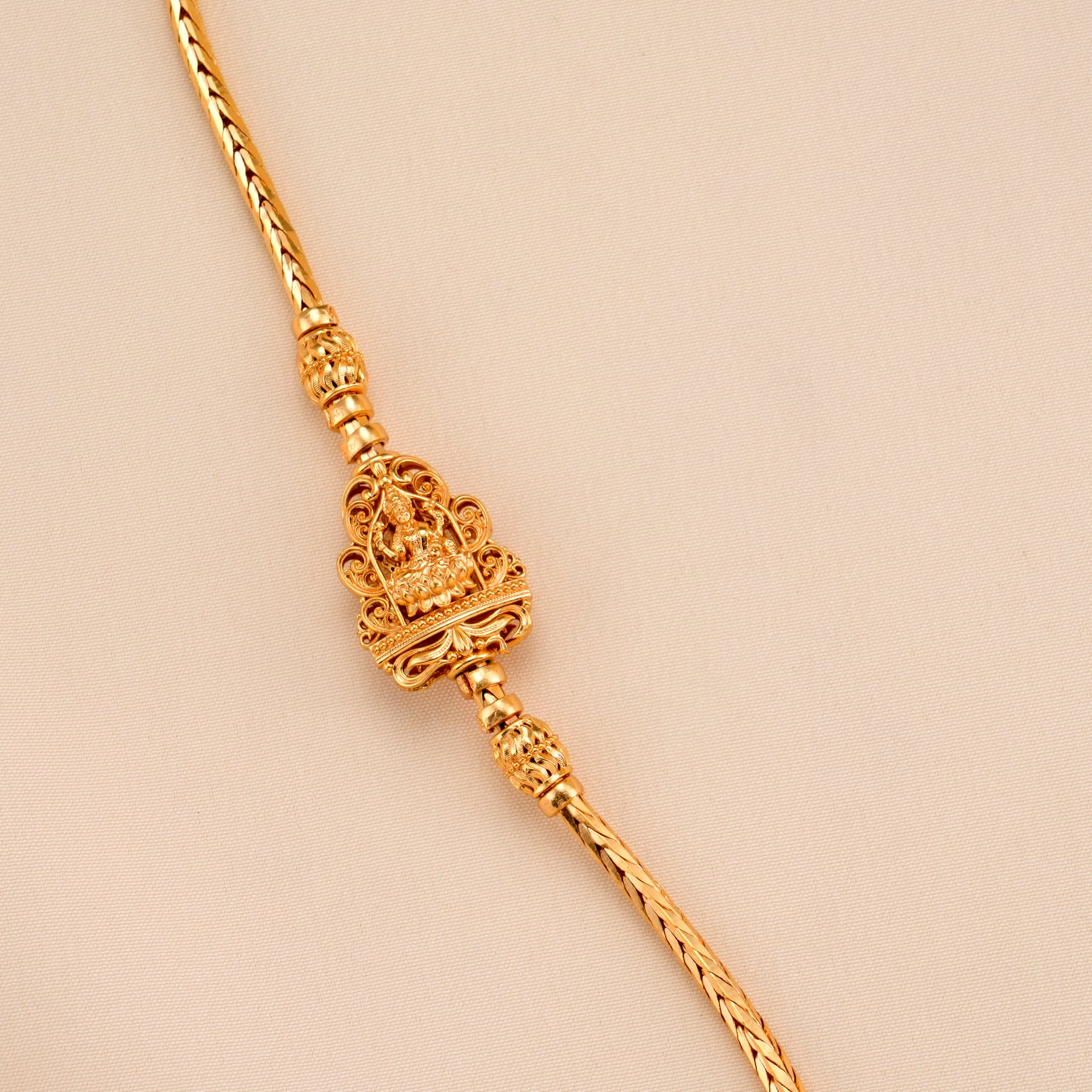 Made from 92.5 silver with gold plating, this chain features a detailed Nagas Lakshmi motif, combining traditional elegance with auspicious design.
