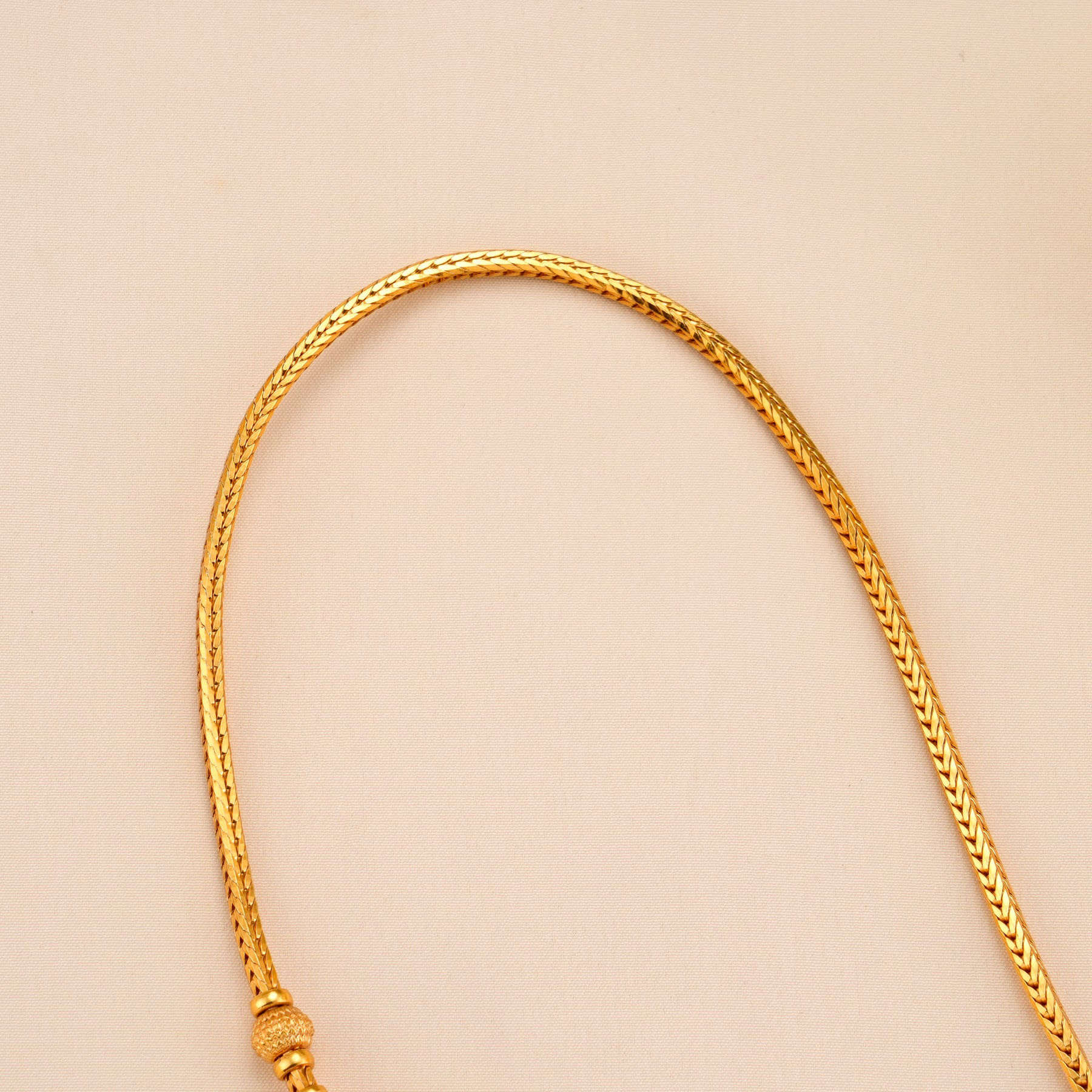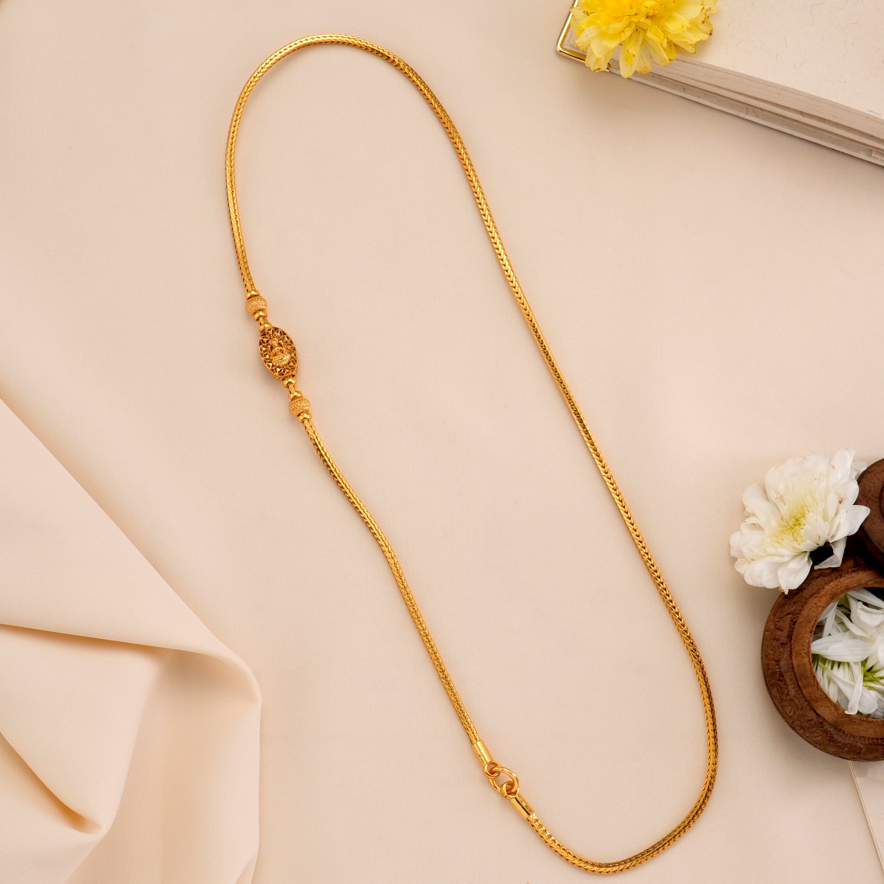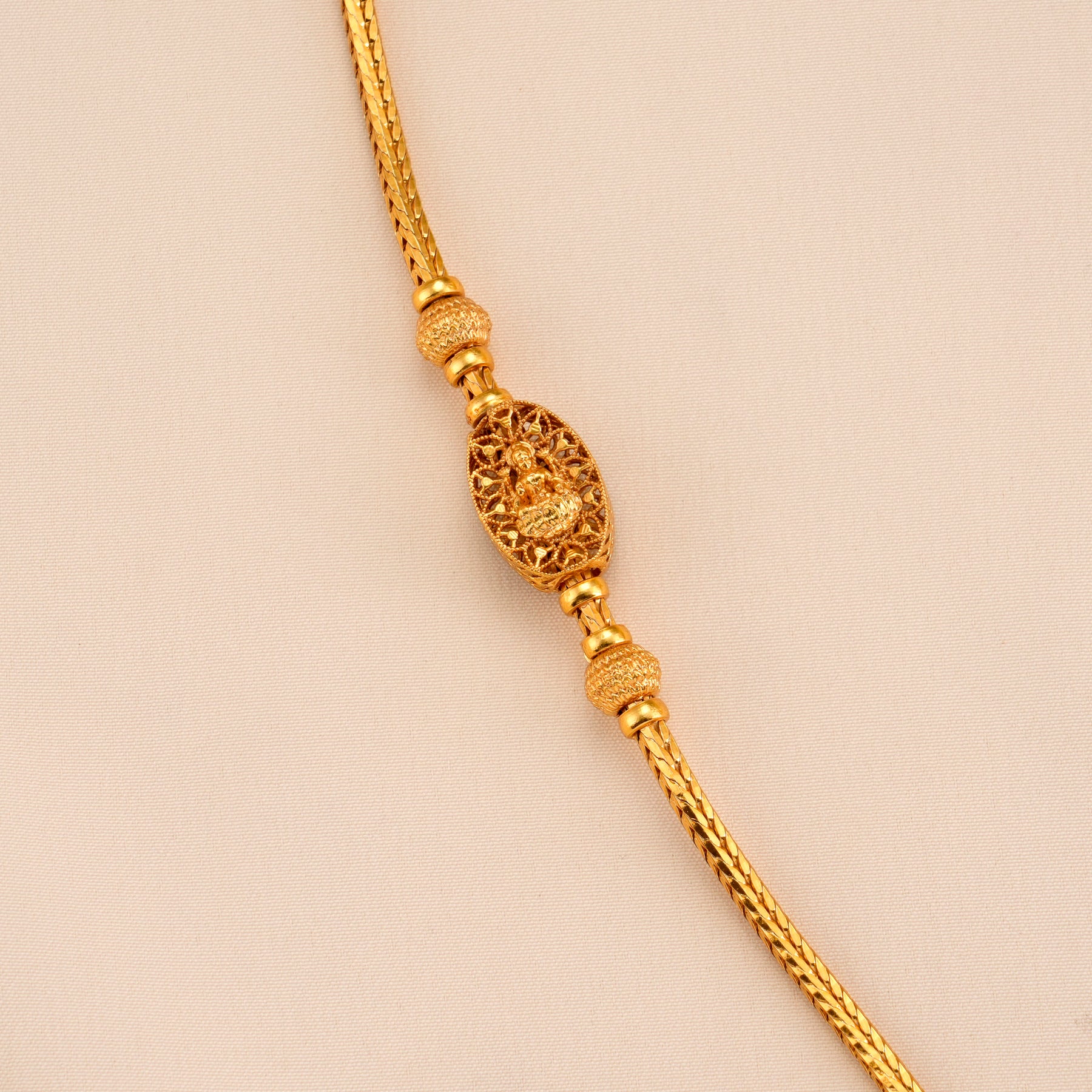 Crafted from 92.5 silver with gold plating, this chain features a smooth oval-shaped Lakshmi design with polished finishing and delicate detailing, offering refined elegance and intricate jewellery craftsmanship.