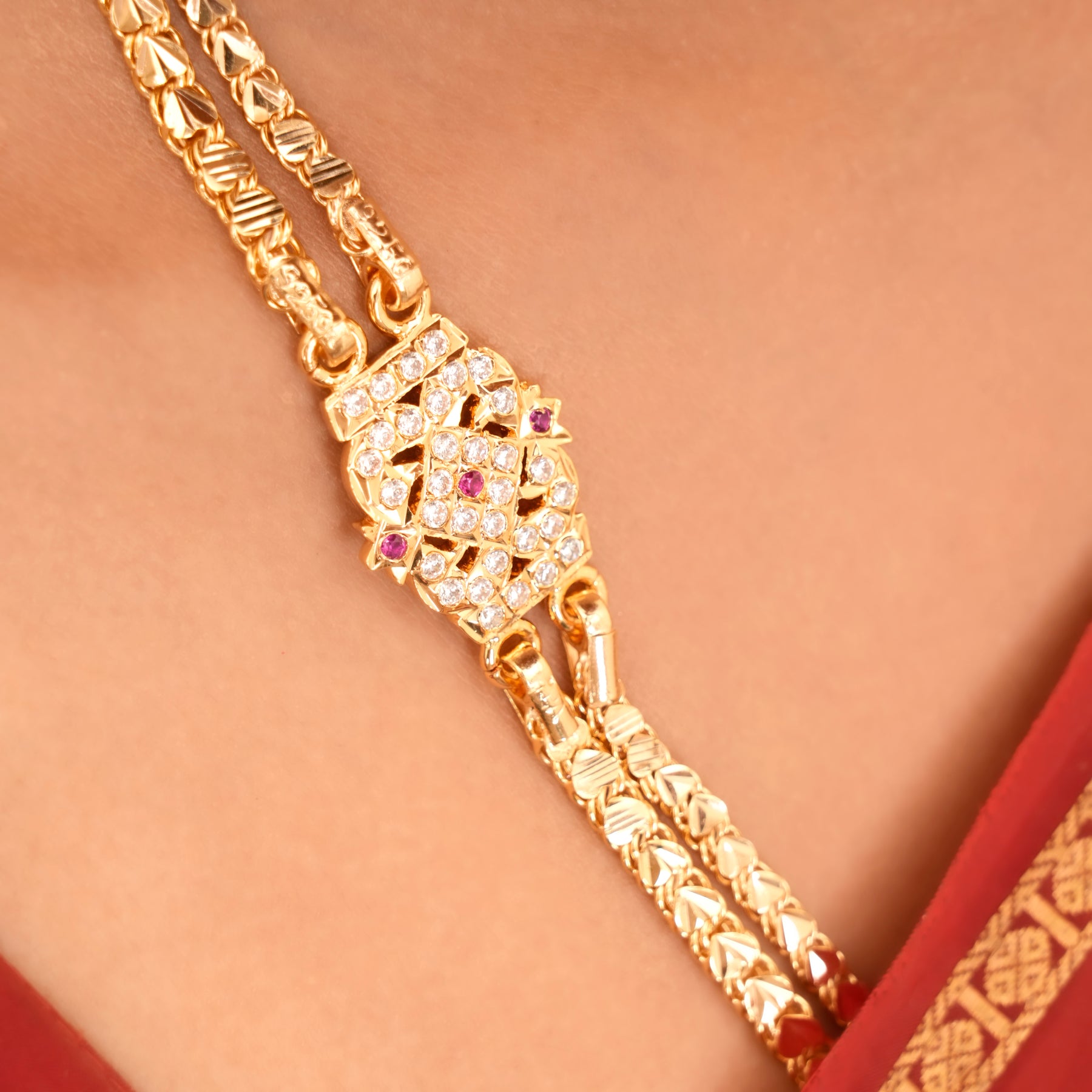 Made from 92.5 sterling silver with gold plating, this Rettai Vadam Mugappu chain features pink stone detailing with traditional double-layer craftsmanship.