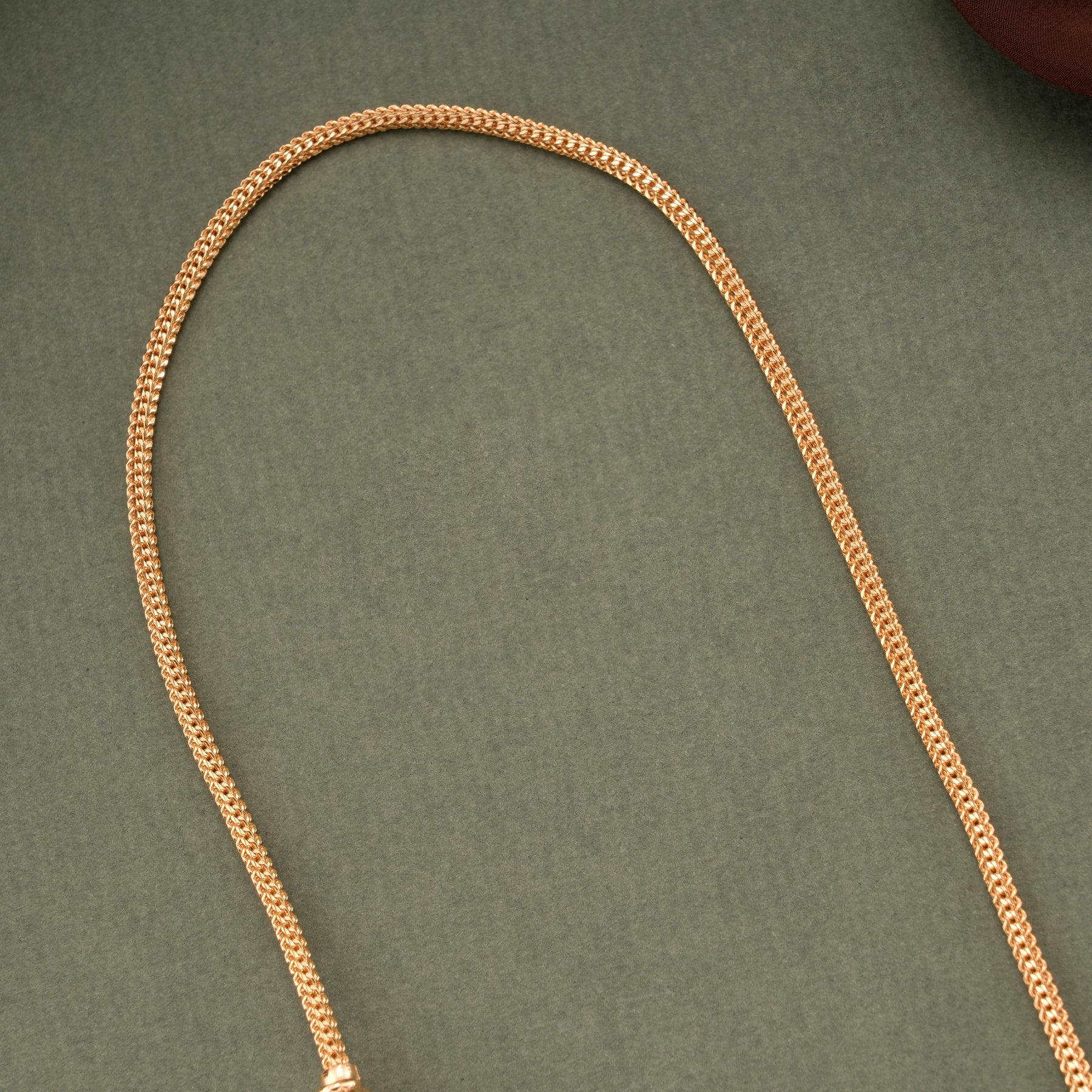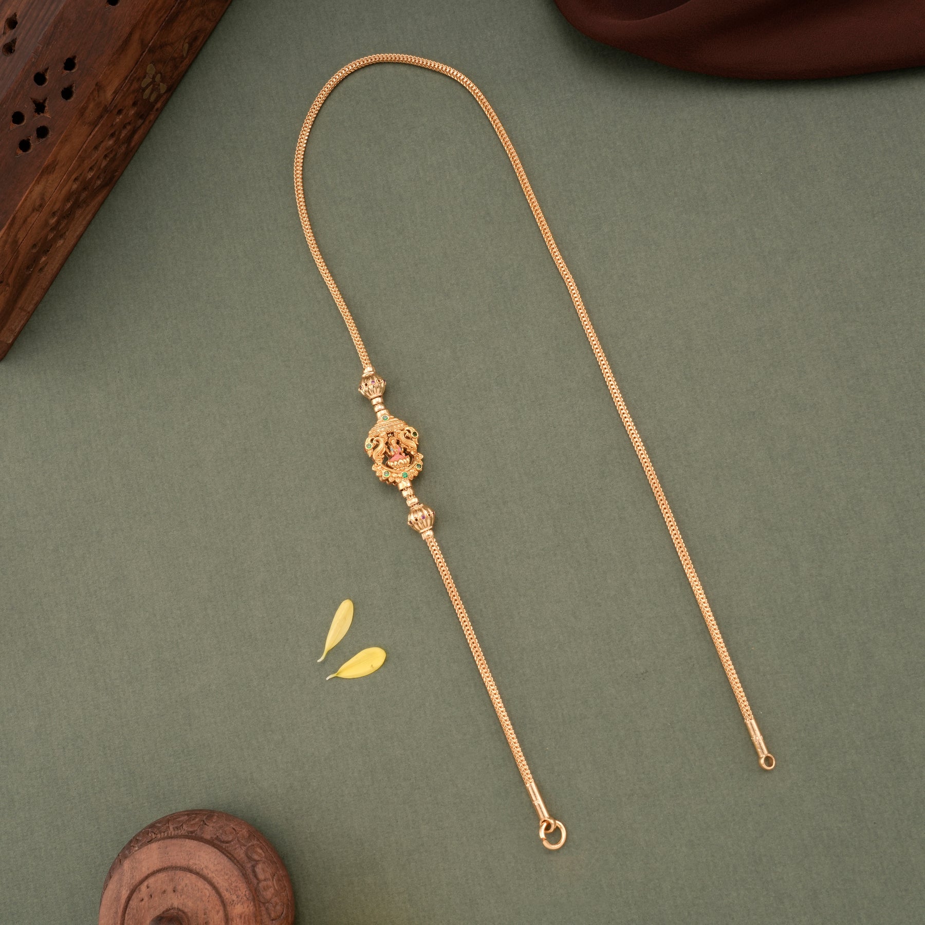 Crafted in 92.5 silver with gold plating, this royal mugappu chain features Goddess Lakshmi with majestic peacock detailing inspired by temple art.