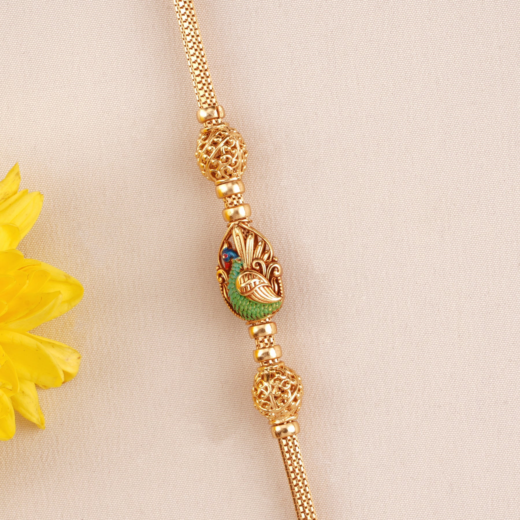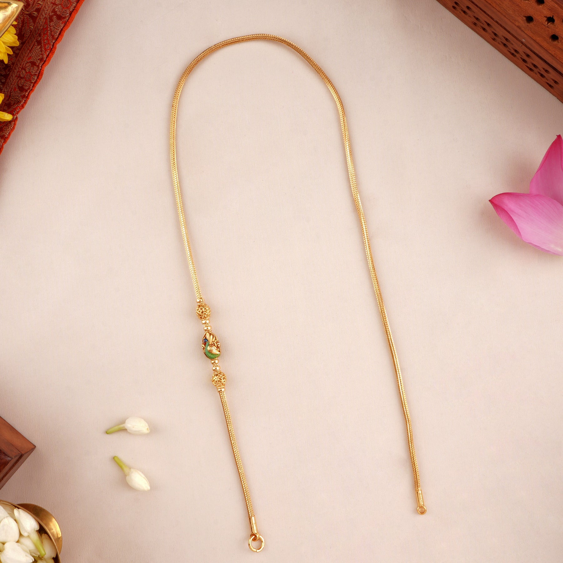 Made of 92.5 silver with gold plating, this chain features a shining peacock pattern symbolizing beauty and grace. Ideal for festive and cultural occasions.