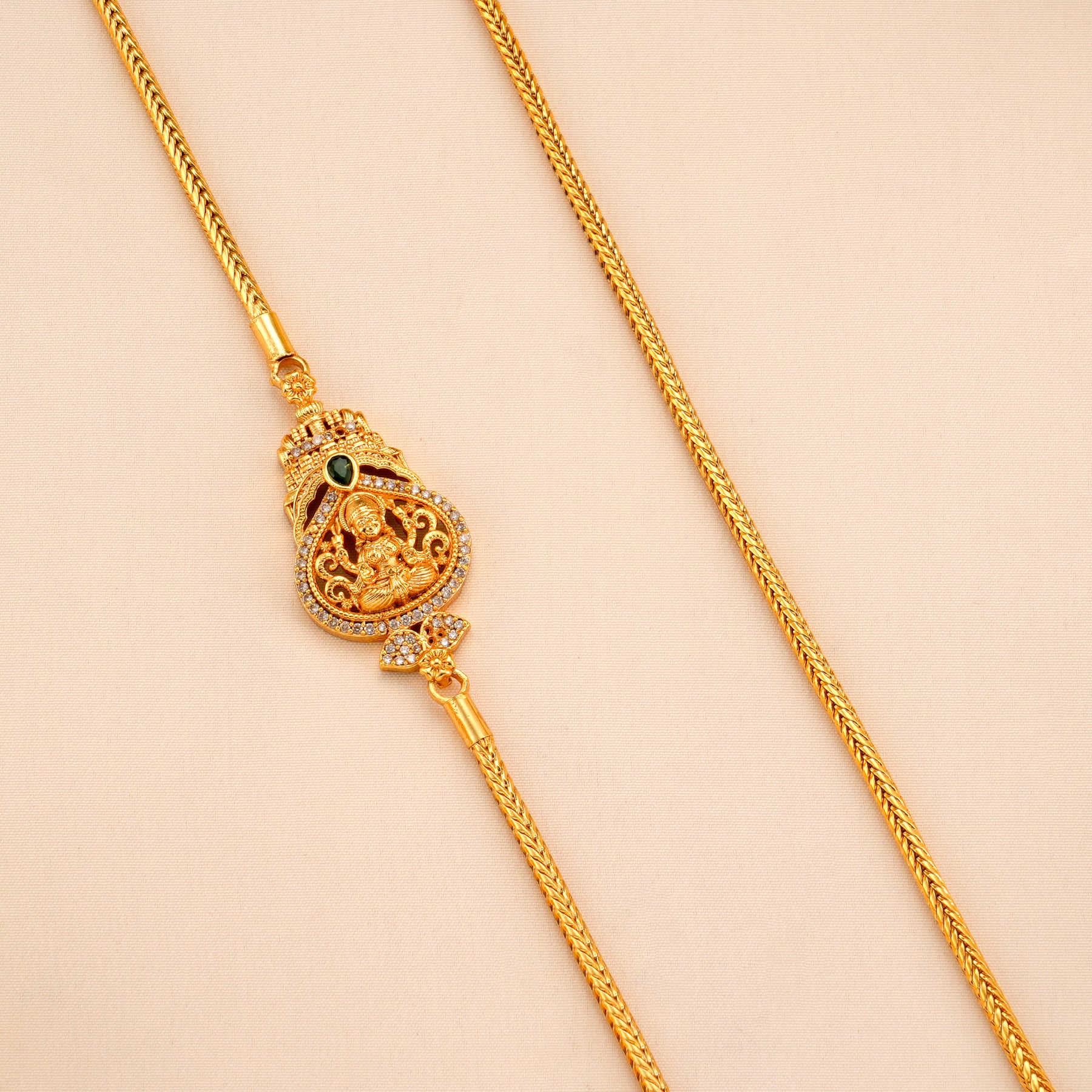 Crafted in 92.5 sterling silver, this chain showcases a Lakshmi design accented with a single sparkling emerald, giving it a regal and sophisticated charm.