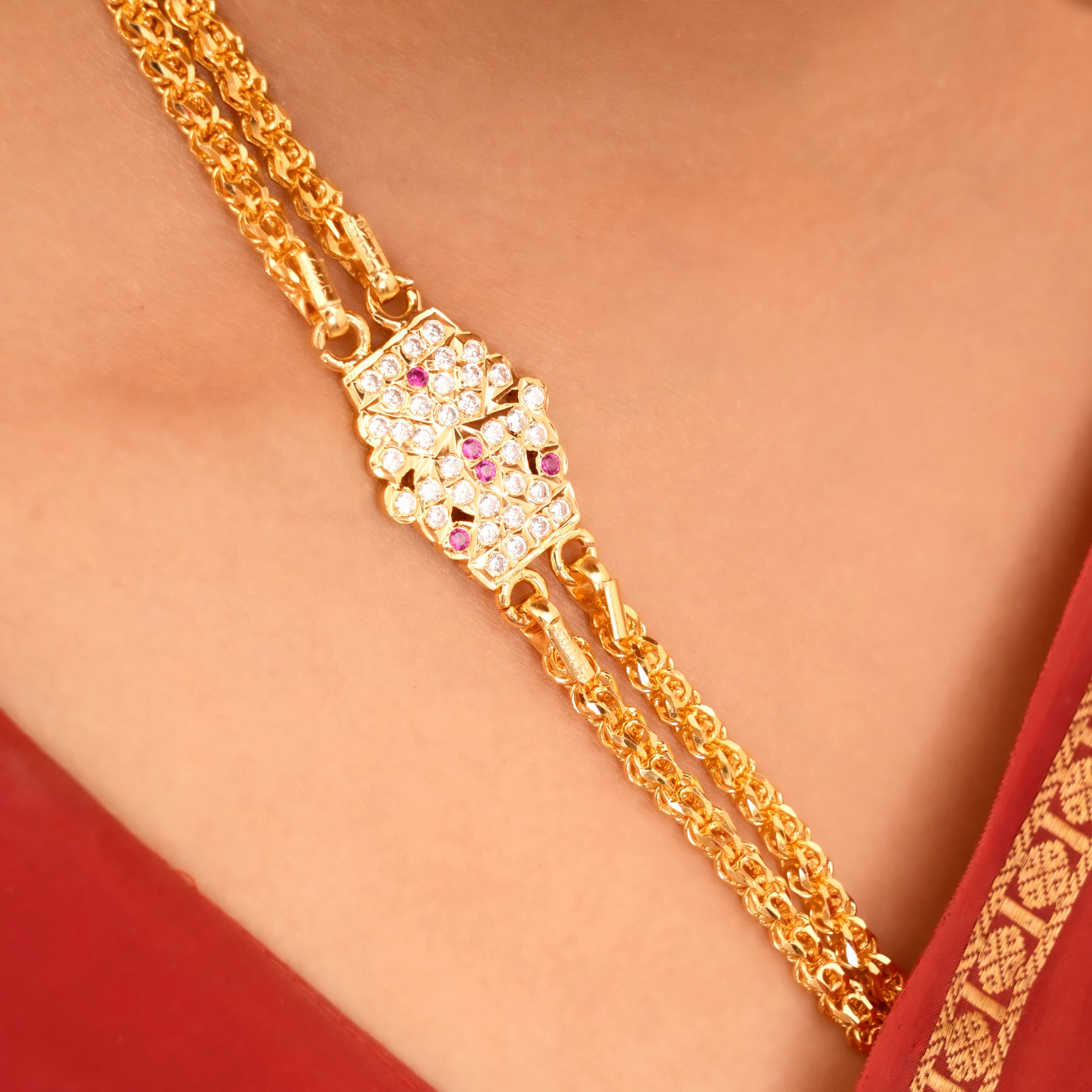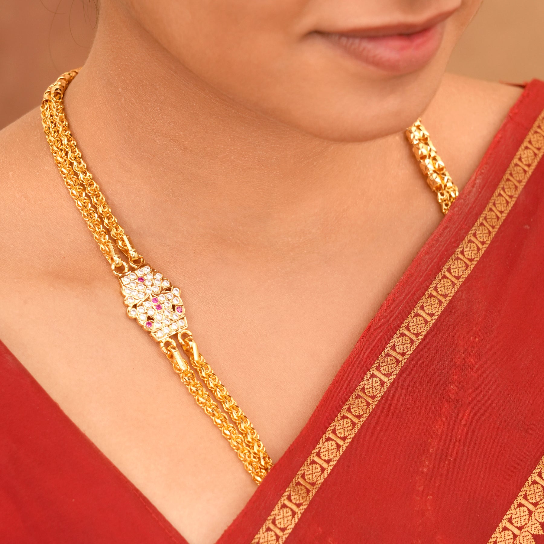 Made from 92.5 sterling silver with gold plating, this Mugappu chain showcases a timeless Rettai Vadam design with classic South Indian detailing.