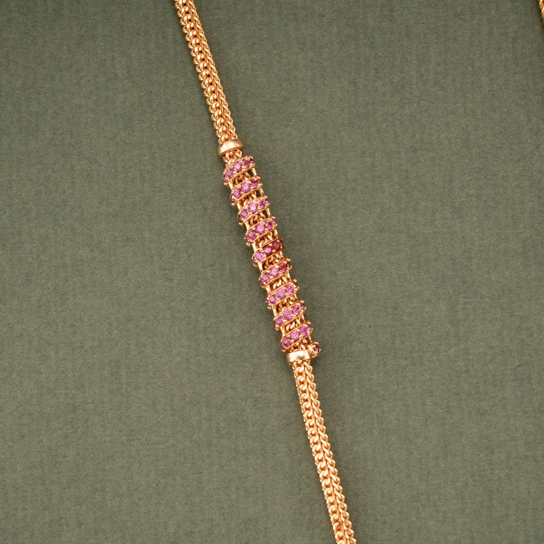 Crafted in 92.5 sterling silver with a gold finish, this Mugappu chain showcases a stylish spiral design embellished with radiant ruby stones, offering a perfect blend of modern charm and traditional beauty.