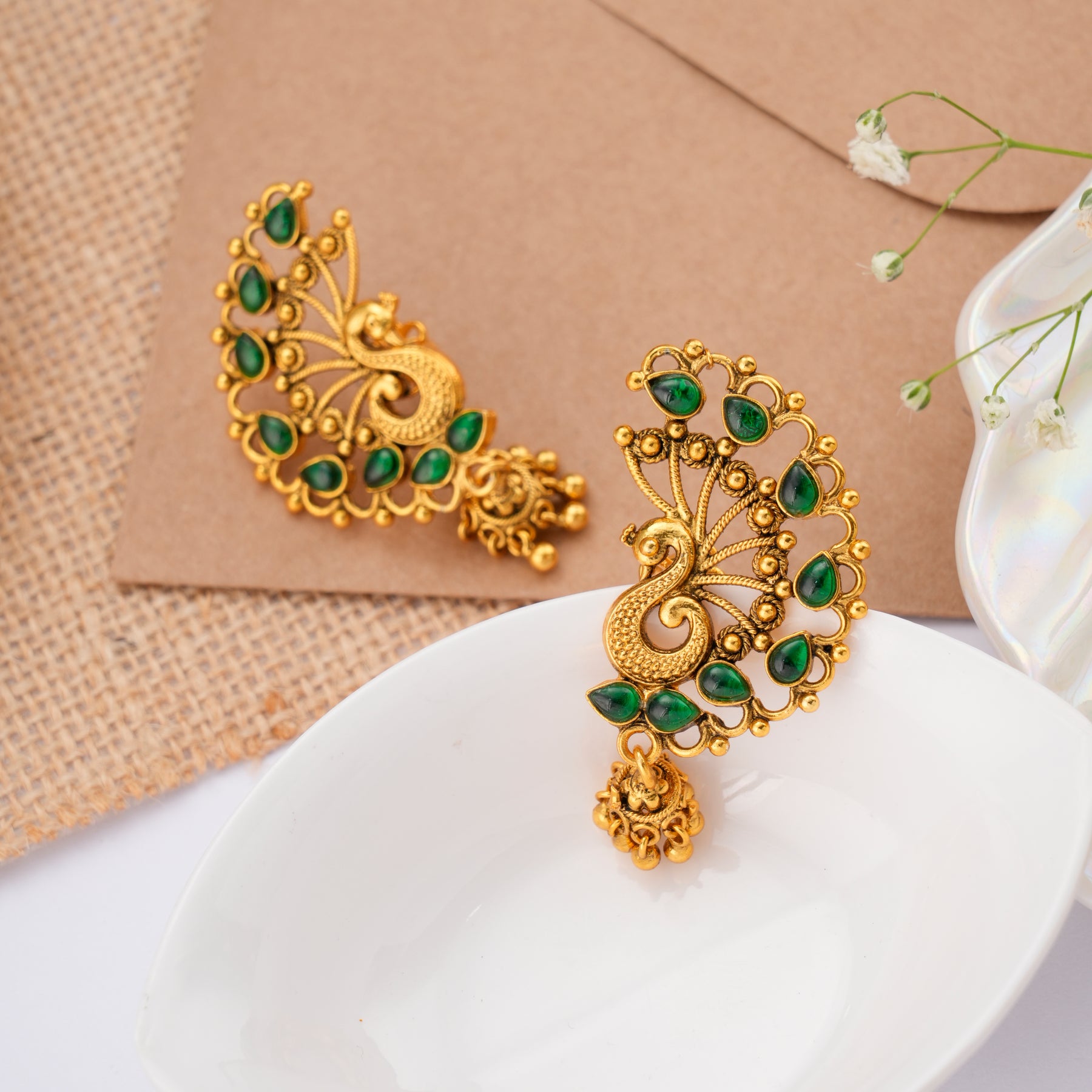 Crafted in 92.5 Silver, nagas peacock emerald golden drop earrings showcase detailed peacock designs and rich emerald stones, finished with floral surface and refined nagas style craftsmanship.