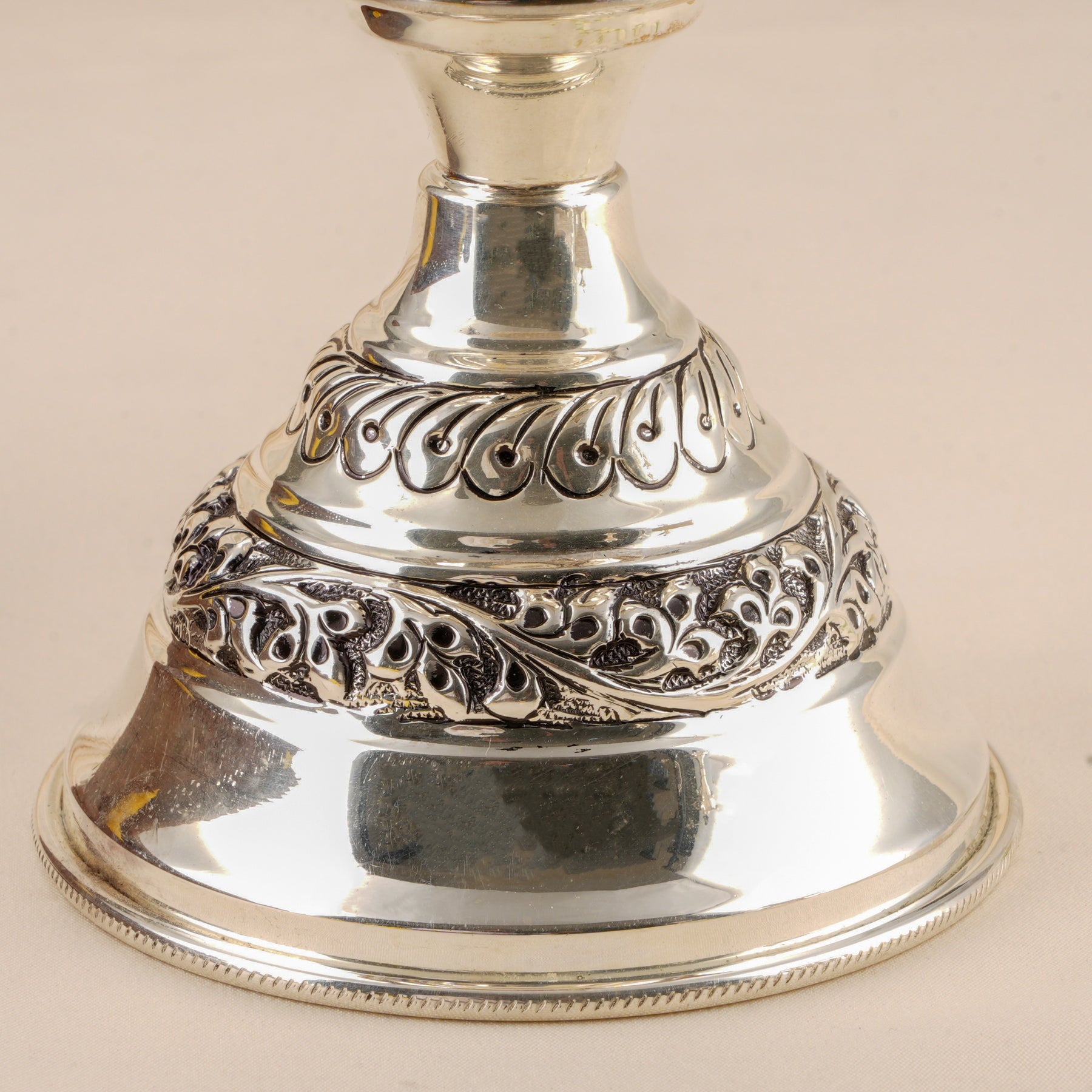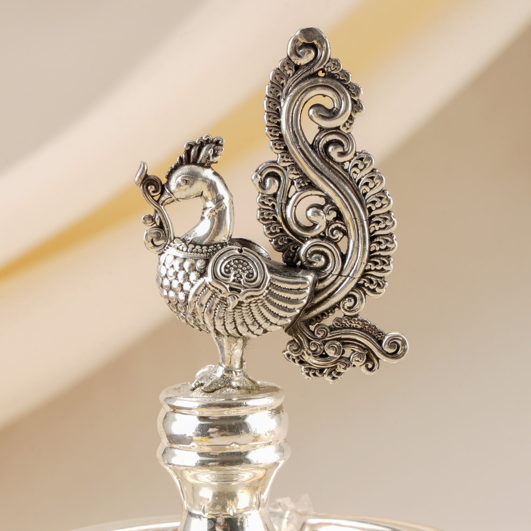 This 92.5 Sterling Silver Peacock Vilakku features antique detailing, symbolizing grace and divinity—ideal for pooja and home arrangement.