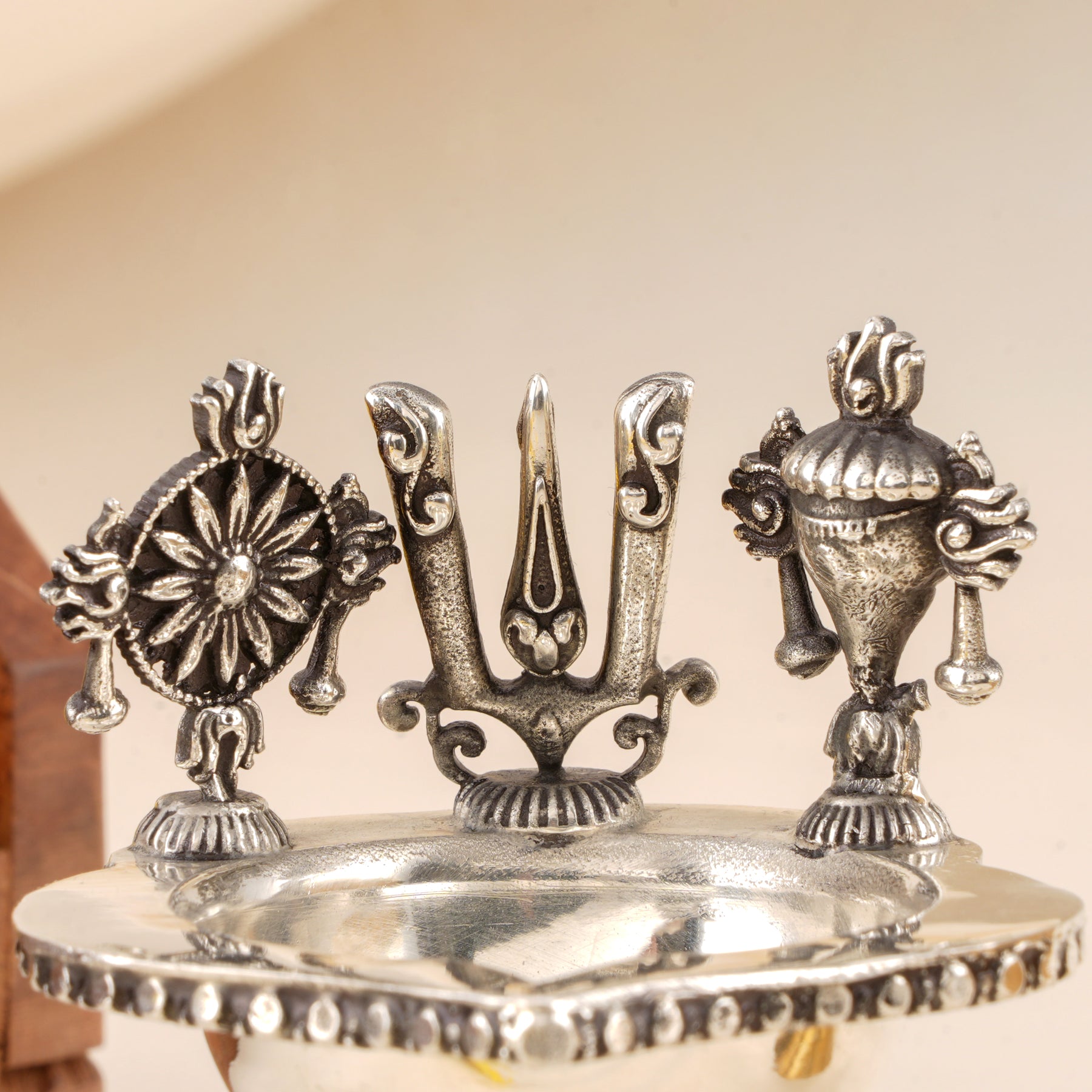 Crafted in 92.5 Sterling Silver, this Shanku Chakra Namam idol symbolizes Vishnu’s protection and energy.