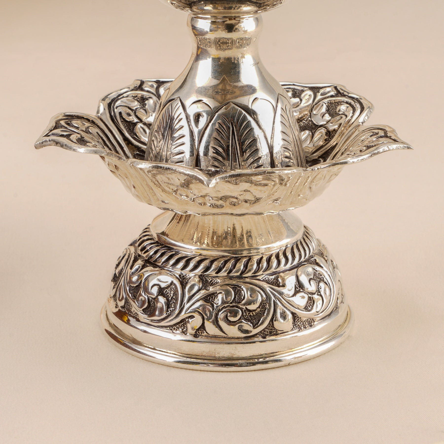 Crafted in 92.5 Sterling Silver, this temple-inspired Lakshmi Vilakku reflects divine elegance and traditional craftsmanship for your pooja rituals.