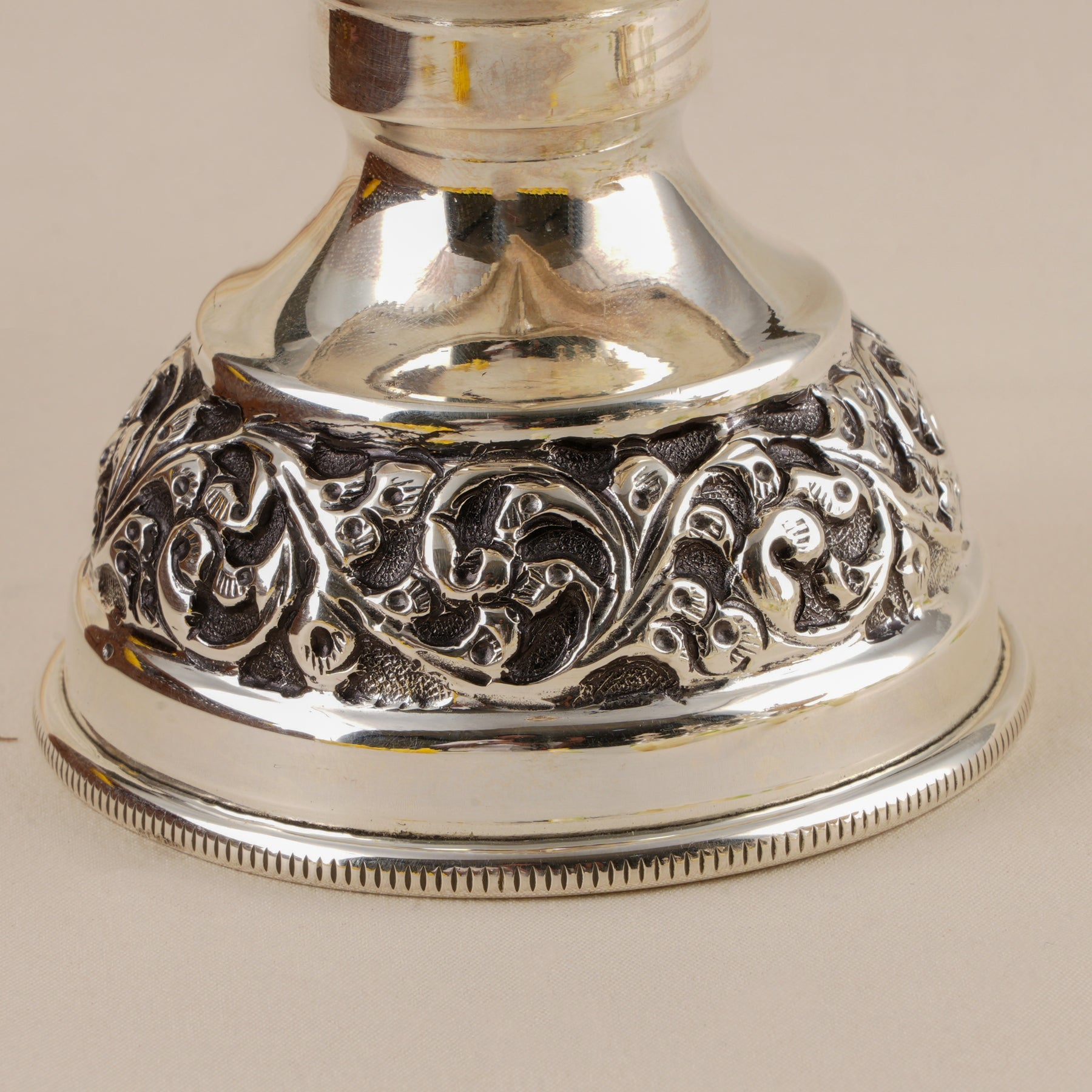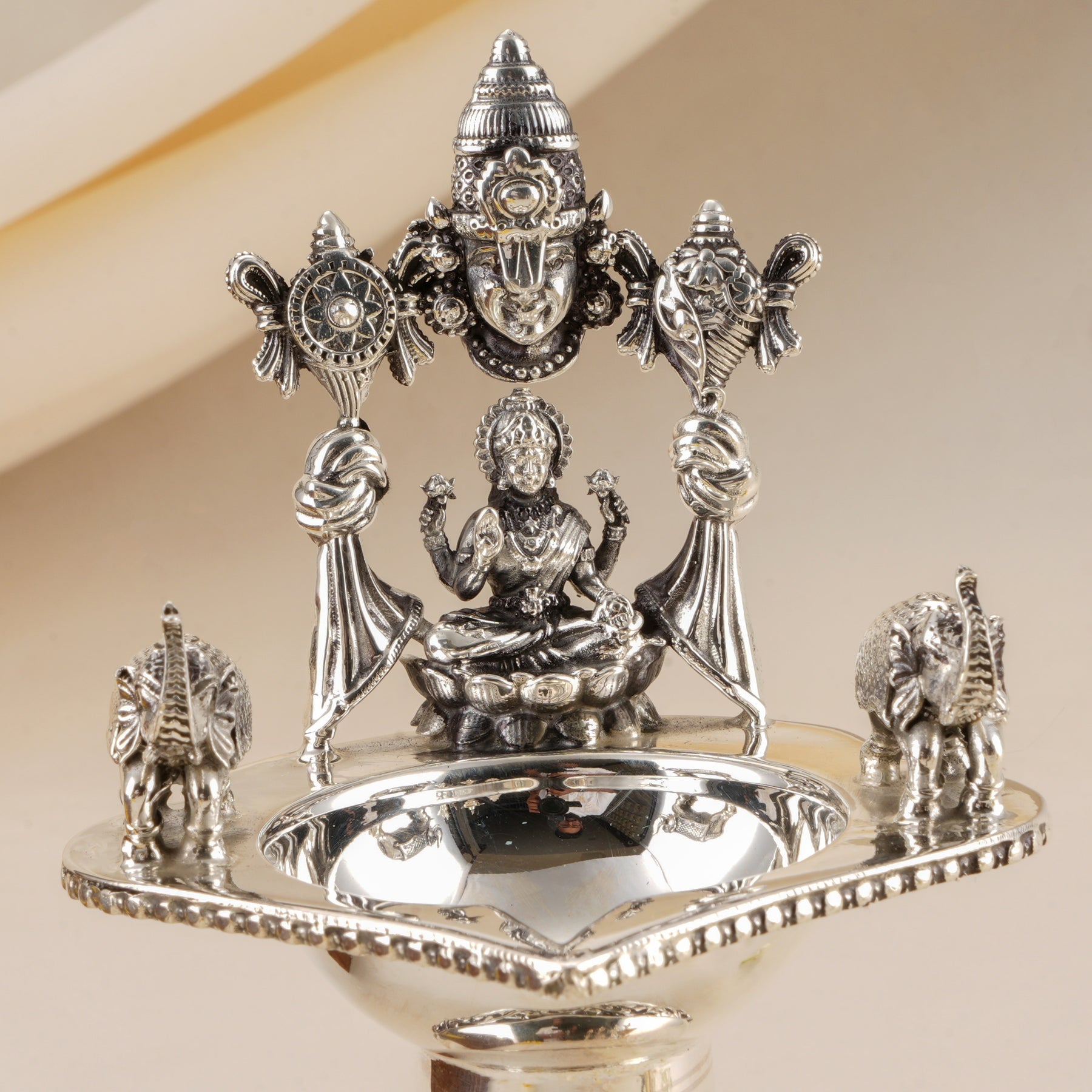 This 92.5 Sterling Silver Vilakku features Lakshmi and Venkateshwara motifs, blending spiritual charm with antique aesthetics for home worship.