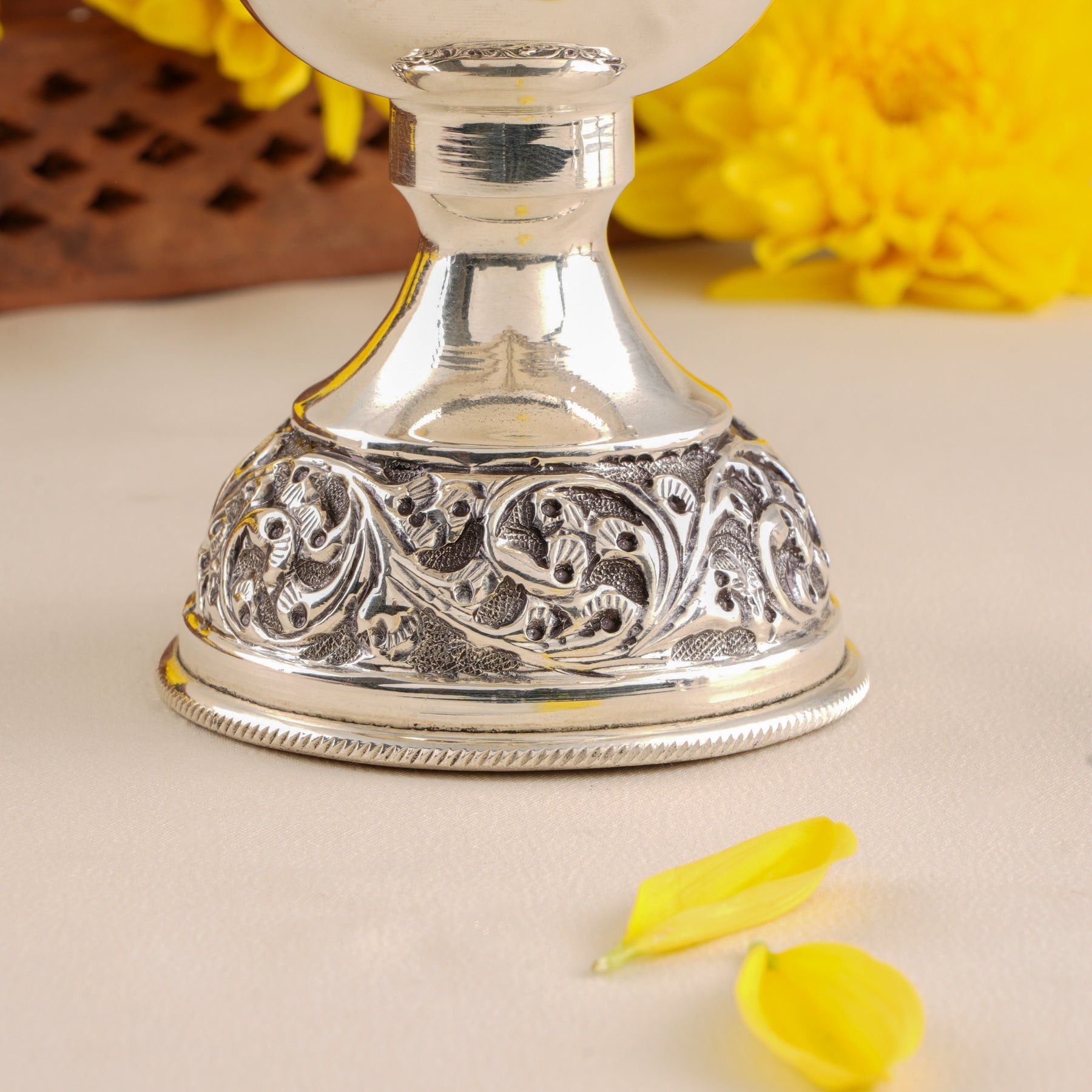 Crafted in 92.5 Sterling Silver, this Lakshmi Vilakku reflects temple-inspired artistry, radiating prosperity and divine energy for your home rituals.
