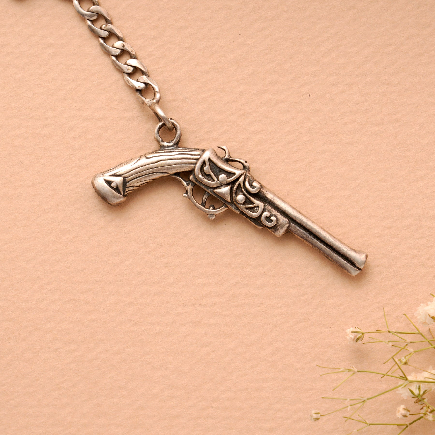 This royal gun-shaped keychain in 92.5 silver blends boldness and creativity. Its unique design and fine details reflect strength and confidence.