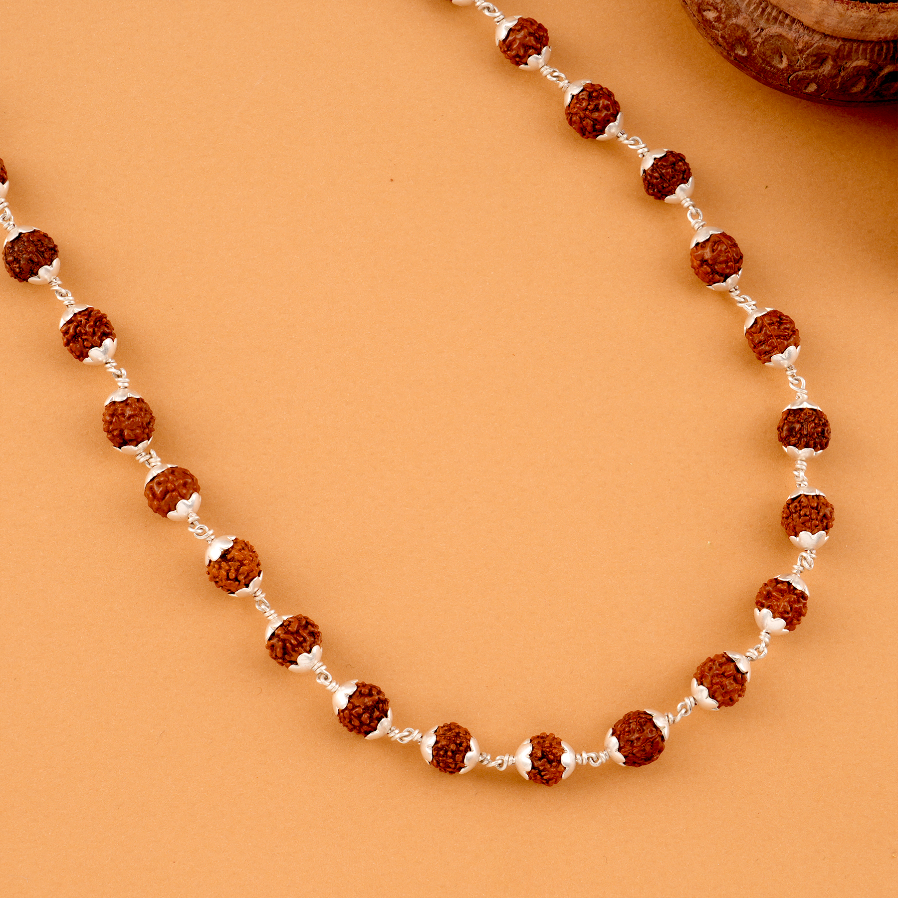 Crafted in standard silver with natural Rudraksha beads, this Elegant Silver Malai combines spiritual energy and intricate design, symbolizing protection, balance, and devotion.