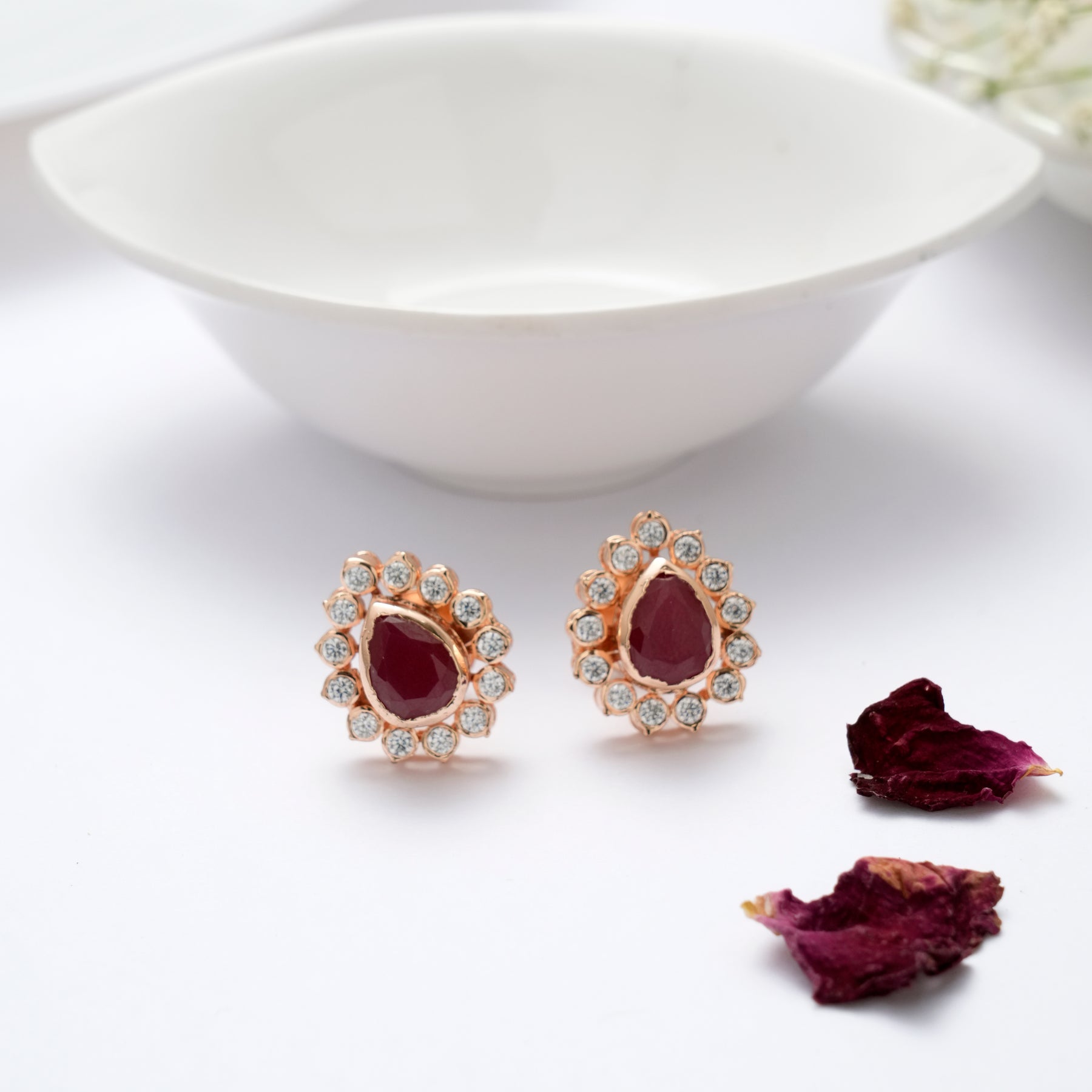 Crafted in 92.5 Silver, oval ruby white stone rose gold studs showcase balanced stone placement and smooth design, enhanced by a soft-toned finish and precise detailing for refined visual appeal.